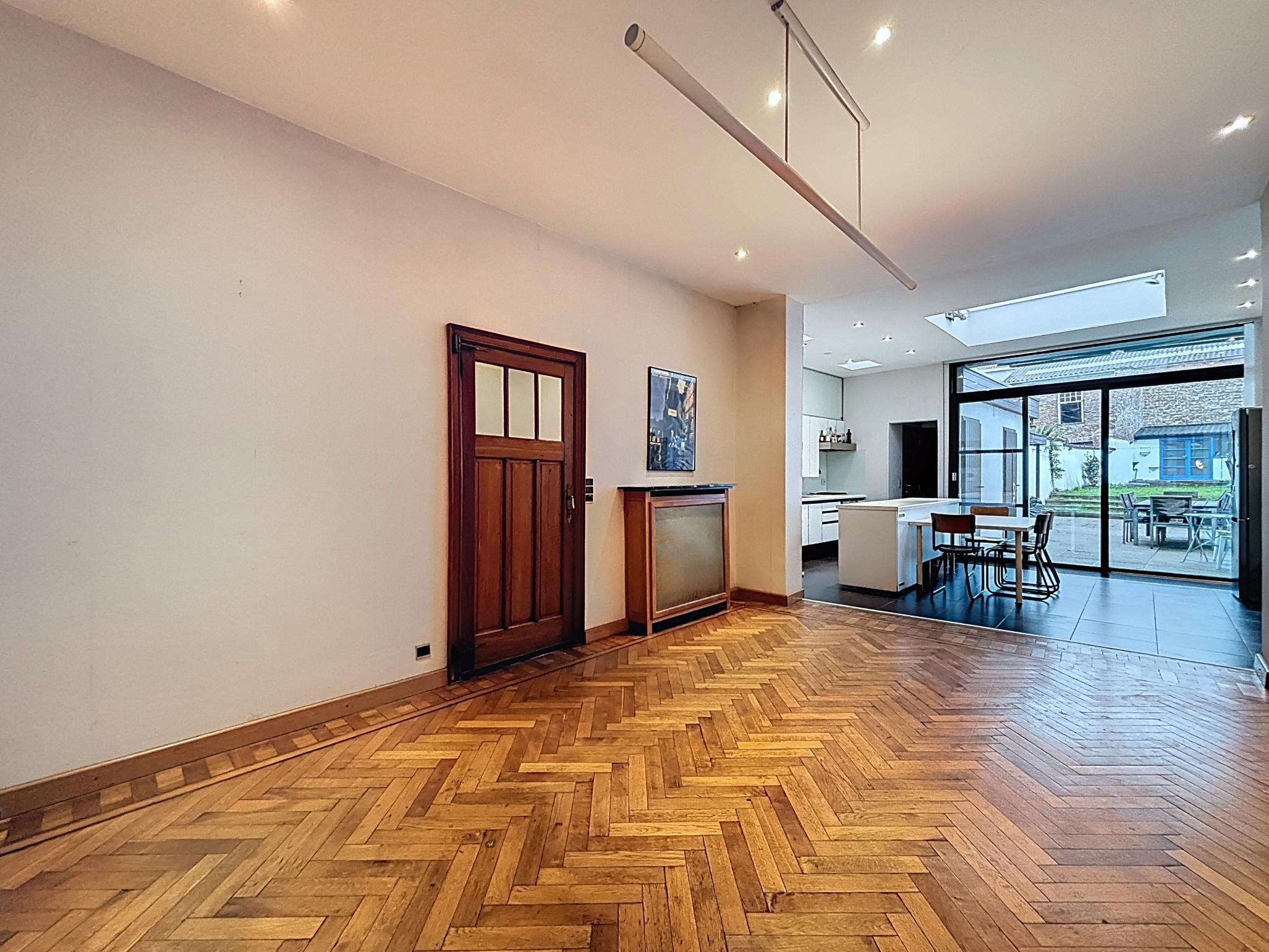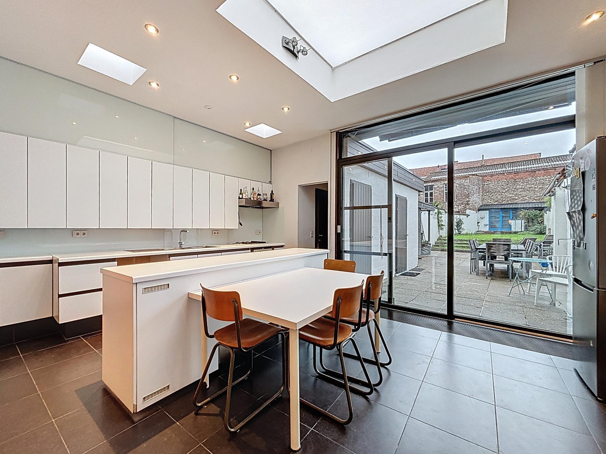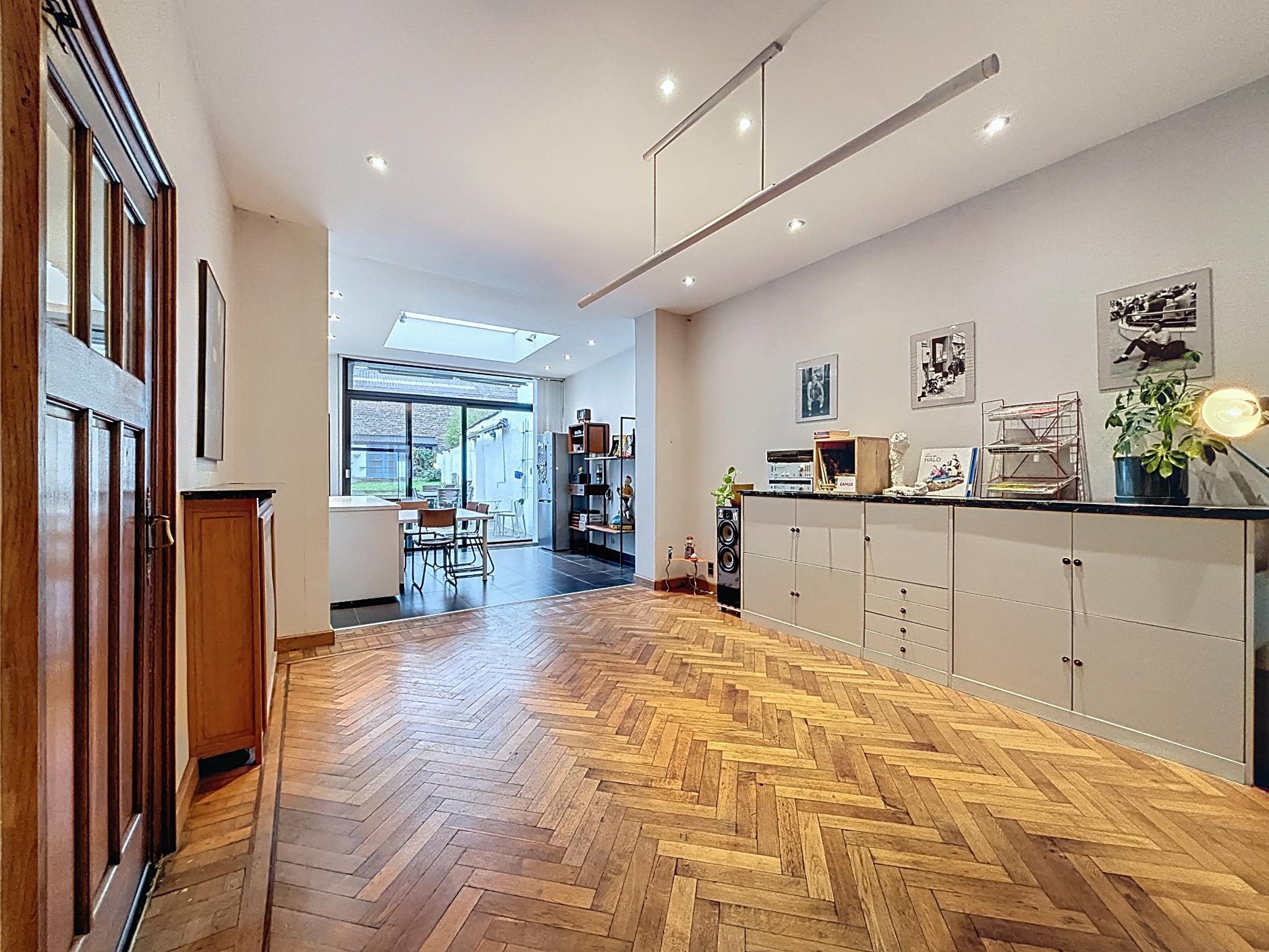 Stap binnen in deze karaktervolle en energiezuinige rijwoning waar authenticiteit en warmte centraal staan. Deze woning ademt sfeer en charme, met behoud van originele elementen die zorgen voor een unieke uitstraling.De ruime leefruimte met apart zit- en eetgedeelte straalt huiselijkheid uit, dankzij de hoge plafonds, houten vloeren en doordachte indeling.De open keuken met zicht op de tuin vormt een gezellige plek waar koken en samenzijn hand in hand gaan.Verder vindt u op het gelijkvloers een gastentoilet, een praktische berging met wasruimte en een ruime kelder.