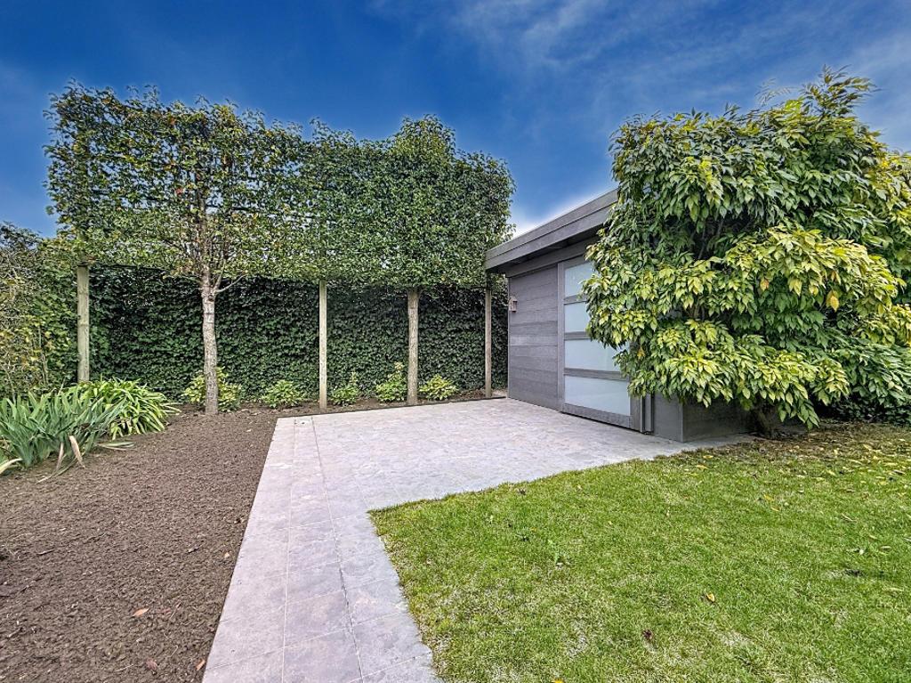 De onderhoudsvriendelijke tuin is aangelegd met een terras en tuinberging, ideaal om buiten te genieten.