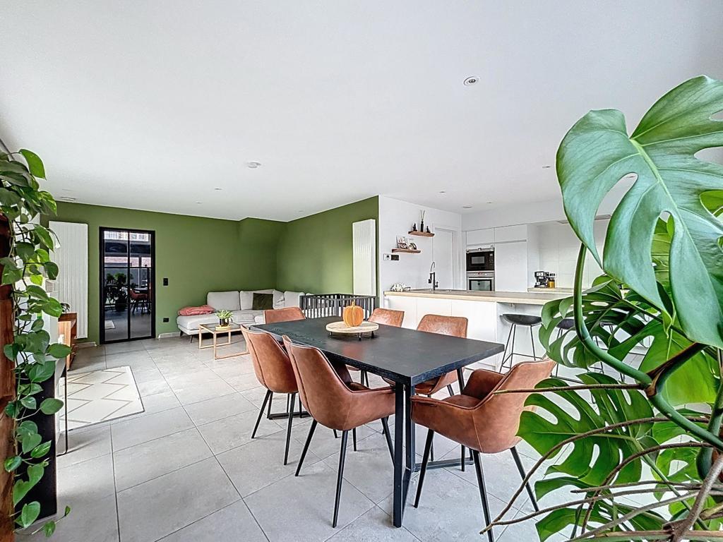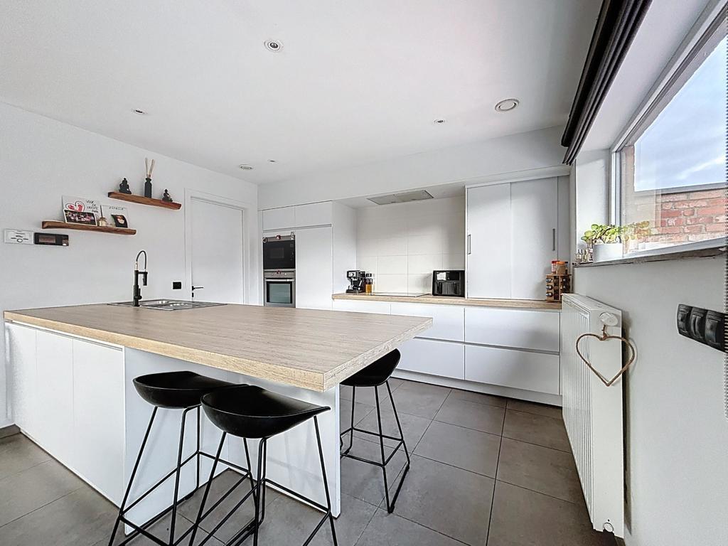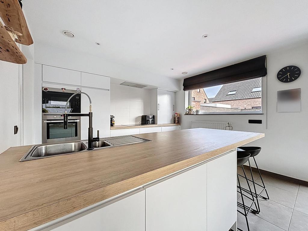 De inkomhal met gastentoilet leidt naar de lichtrijke leefruimte met zithoek en eetplaats, die naadloos aansluit op de open, volledig ingerichte keuken met zicht op de tuin.