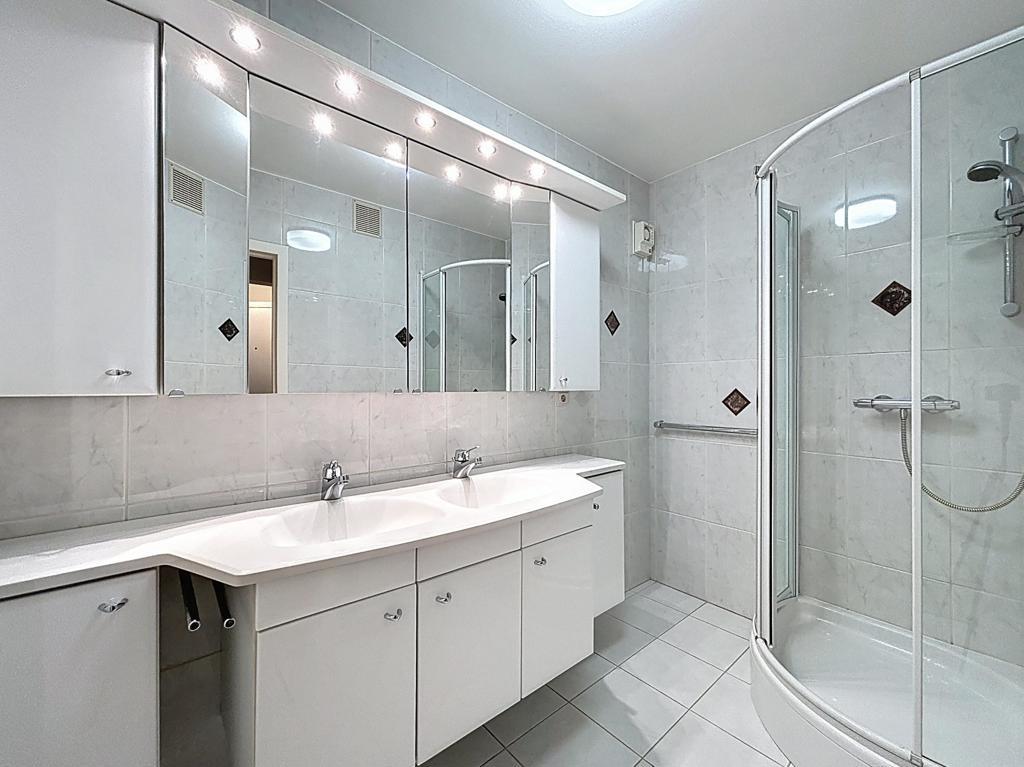 De badkamer is uitgerust met een douche en dubbele lavabo.
