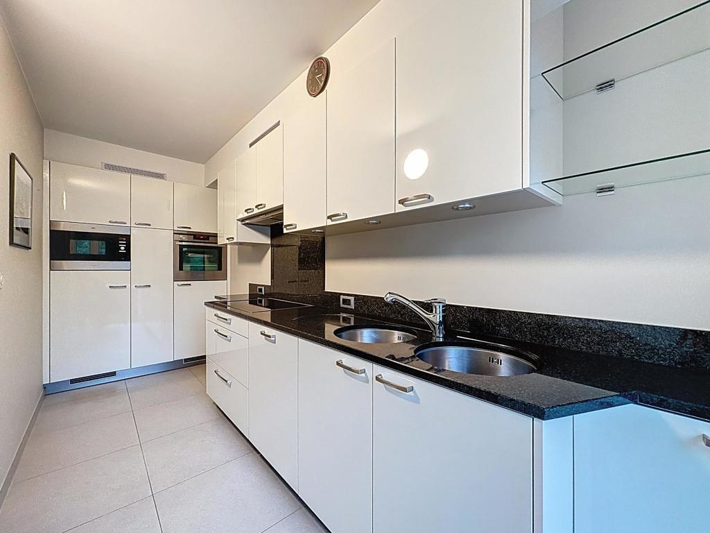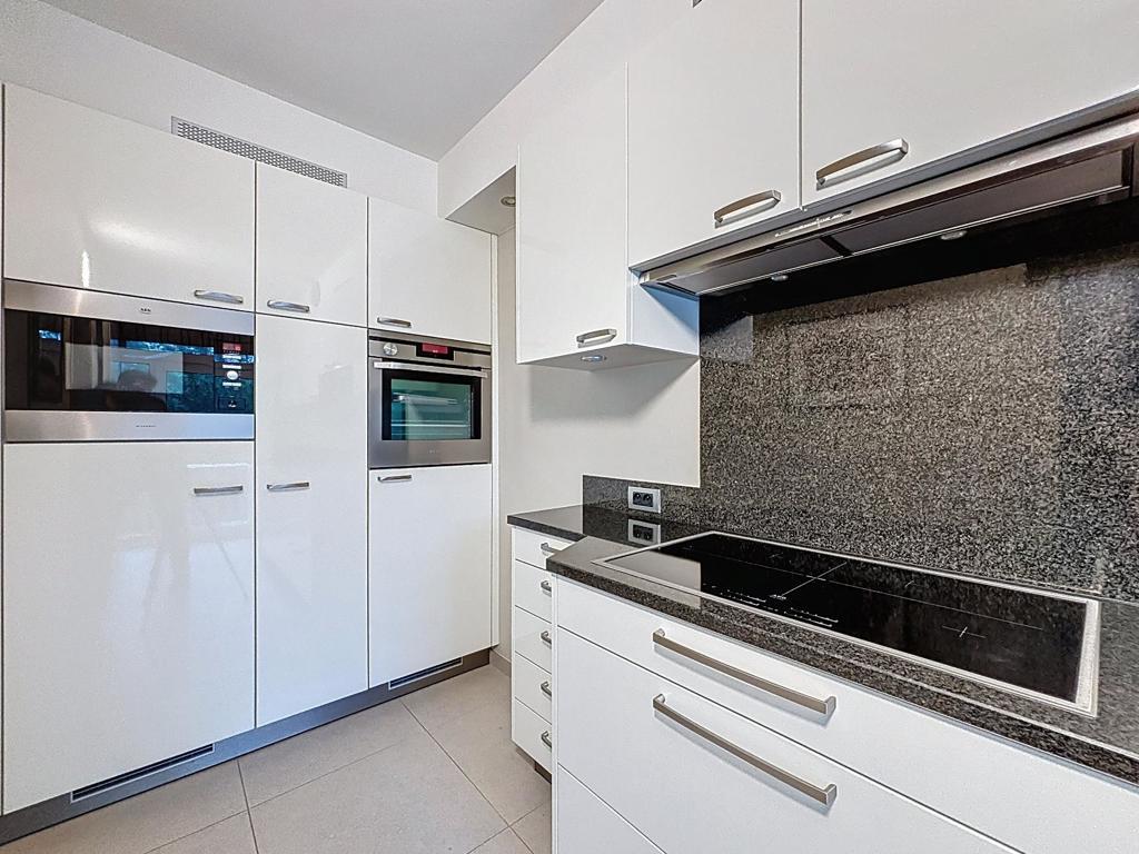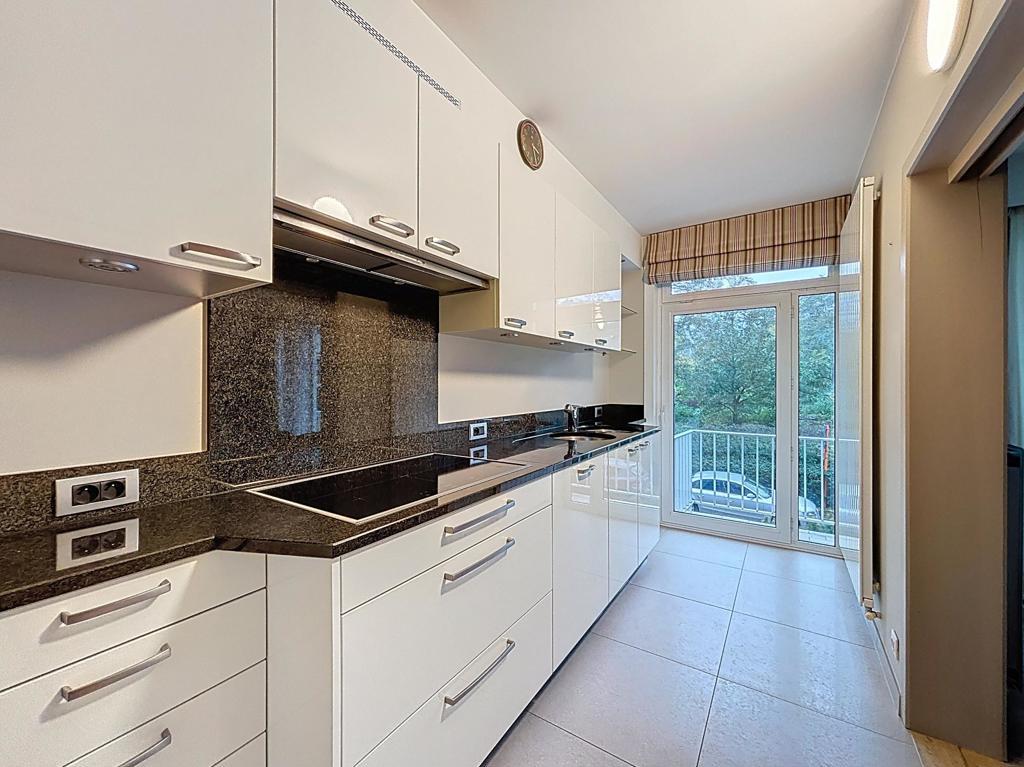 De ingerichte keuken met moderne toestellen geeft toegang tot een zonnig balkon met mooi uitzicht op het park.