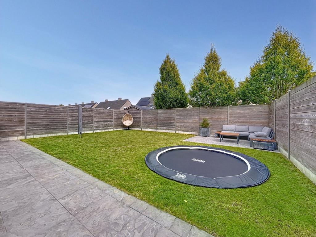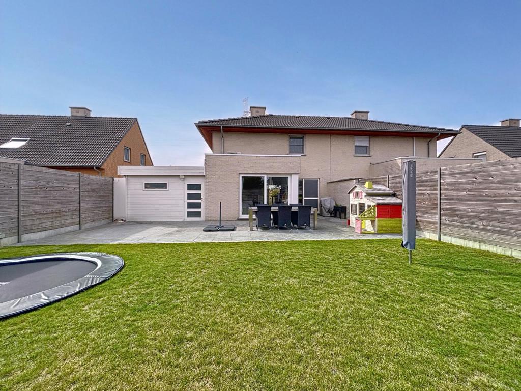 De inpandige garage werd deels omgevormd tot een praktische wasplaats en extra bergruimte. Achteraan is de volledig afgesloten tuin een echte troef: een ruim terras, een ingegraven trampoline, een extra zonneterras en een handige tuinberging met doorgang naar de carport.
