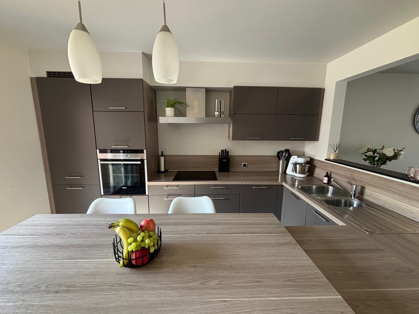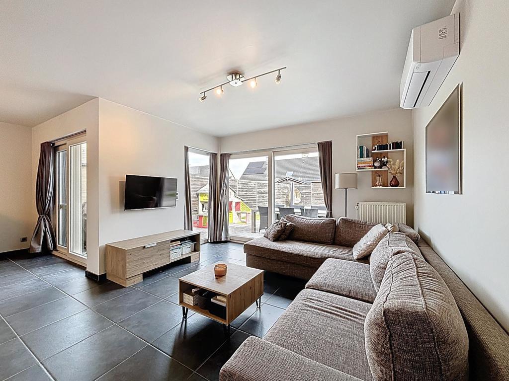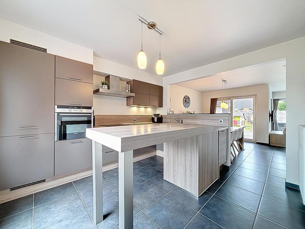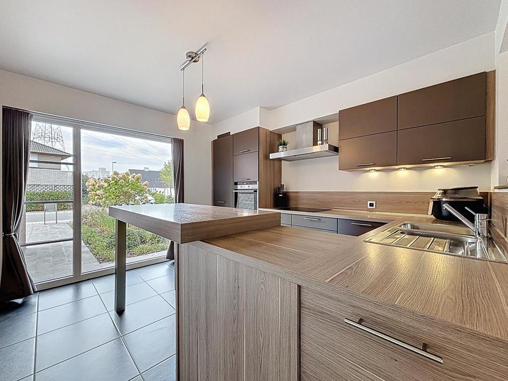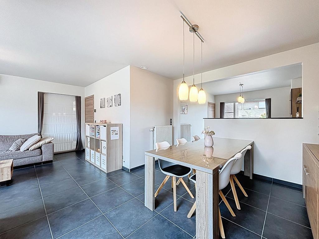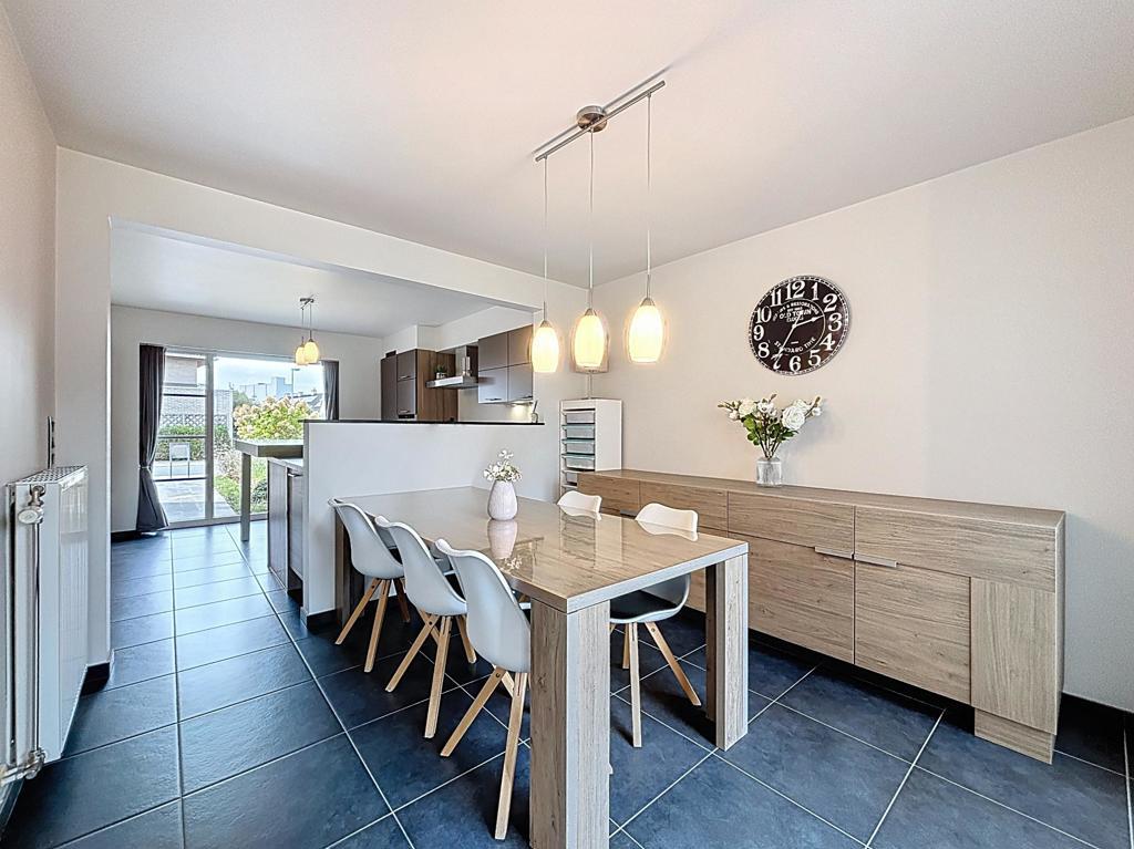 Bij het binnenkomen word je ontvangen in de inkomhal met gastentoilet. De lichtrijke leefruimte met gezellige zit- en eethoek sluit naadloos aan op de halfopen, volledig uitgeruste keuken met verhoogde eettafel – ideaal voor wie graag kookt en samen geniet.