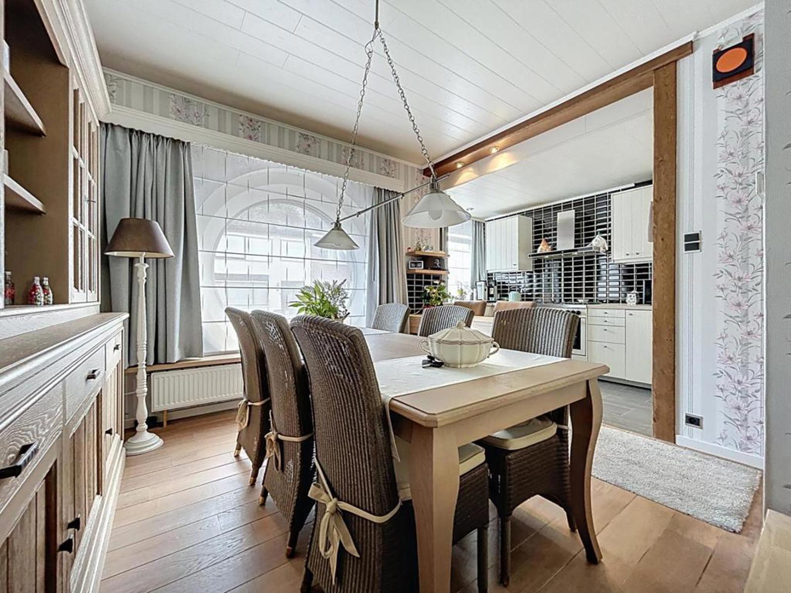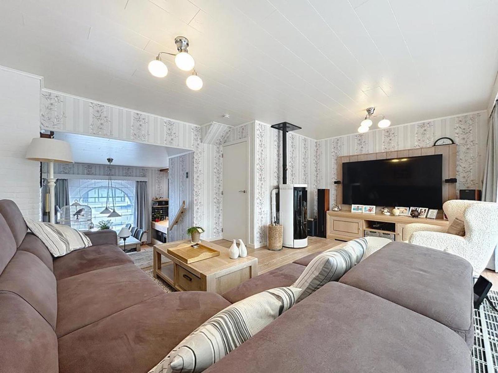 Deze centraal gelegen halfopen bebouwing bevindt zich in een rustige buurt en biedt heel wat comfort. De woning bestaat uit een inkomhal met gastentoilet, een gezellige leefruimte met eet- en zithoek, een uitgeruste keuken, veranda en een onderhoudsvriendelijke tuin met zonnig terras, buitenkamer en een dubbele garage met werkplaats.