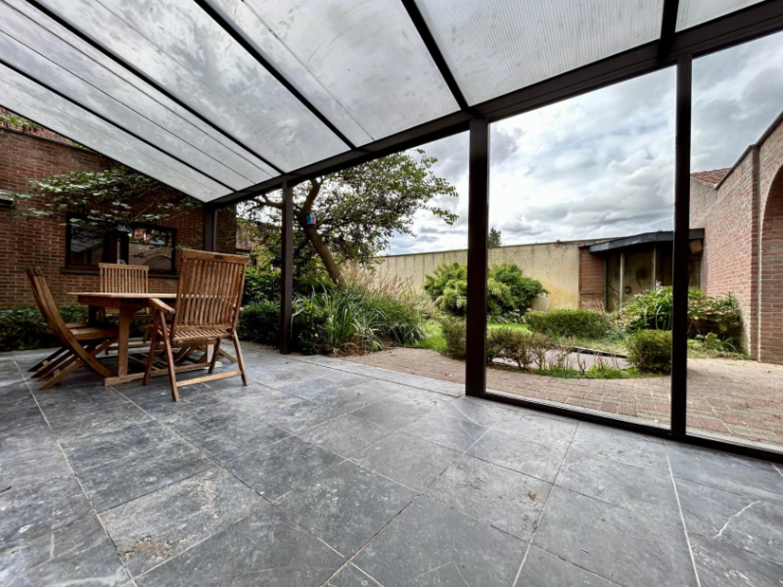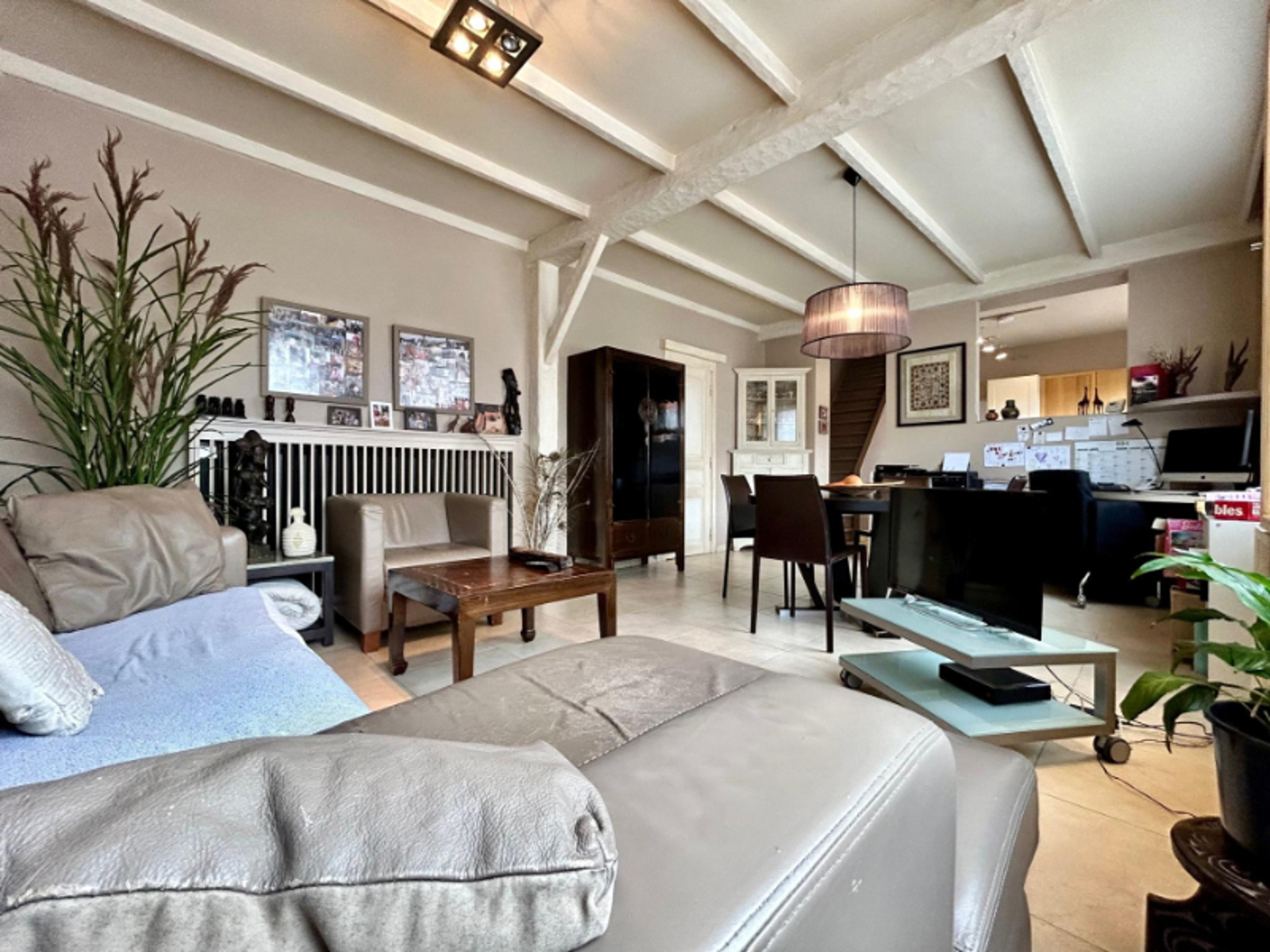 Centraal gelegen woning, bestaande uit een handelsruimte/bureel, lichtrijke woonkamer, volledig uitgeruste keuken met eetplaats, werkplaats van +/-135 m² en een aangelegde tuin met groot overdekt terras. Op het eerste verdiep zijn 2 slaapkamers, dressing, 2 badkamers en een polyvalente ruimte met veel ingemaakte kasten. Via een vaste trap bereik je de 2de verdieping waar nog 2 ruime slaapkamers zijn voorzien.