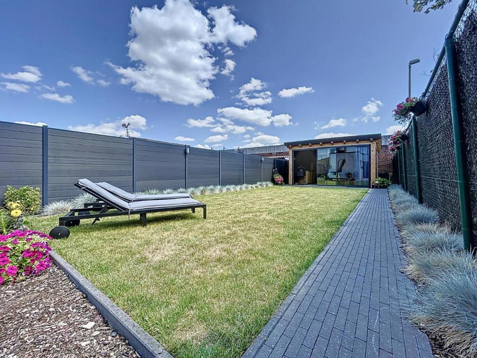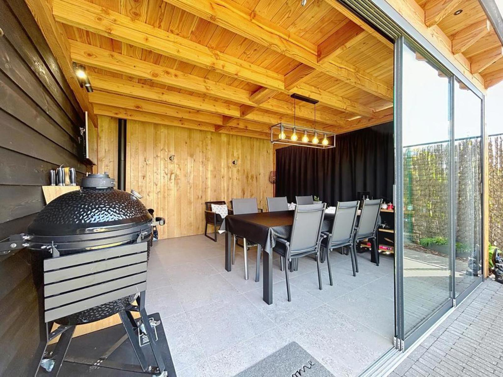 Energiezuinige halfopen bebouwing op een interessante locatie, bestaande uit een inkomhal met ingemaakte vestiaire, gezellige leefruimte met gashaard, volledig uitgeruste keuken met ontbijthoek en eetplaats, afzonderlijk toilet, was-/bergruimte met ligbad en wastafel, garage met sectionale poort en een zuidgerichte tuin met aangelegd terras. In de tuin bevindt zich een tuinberging met een afgewerkte polyvalente ruimte en extra keuken.