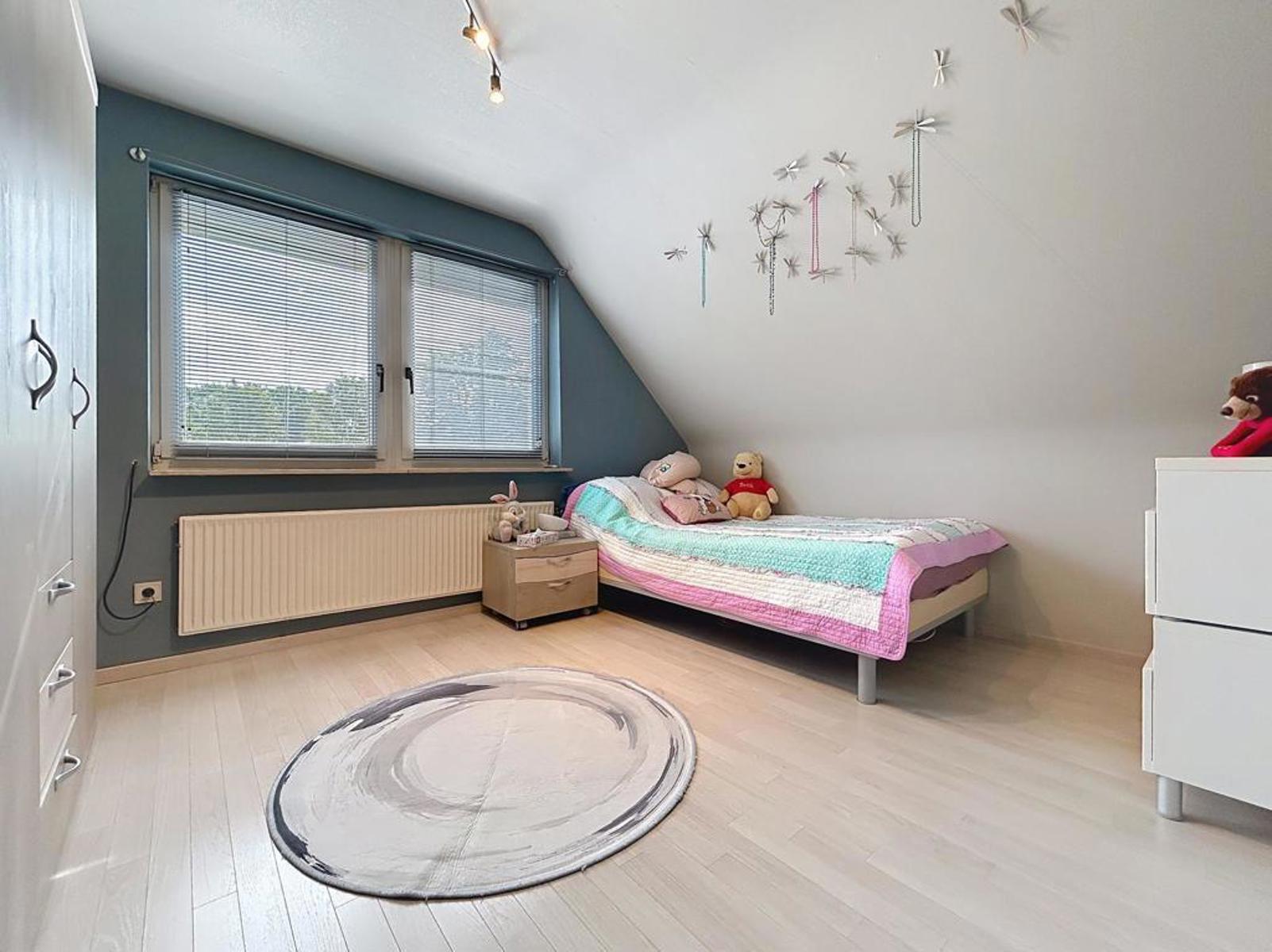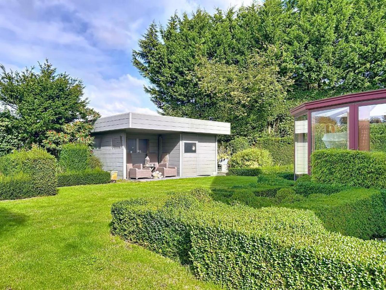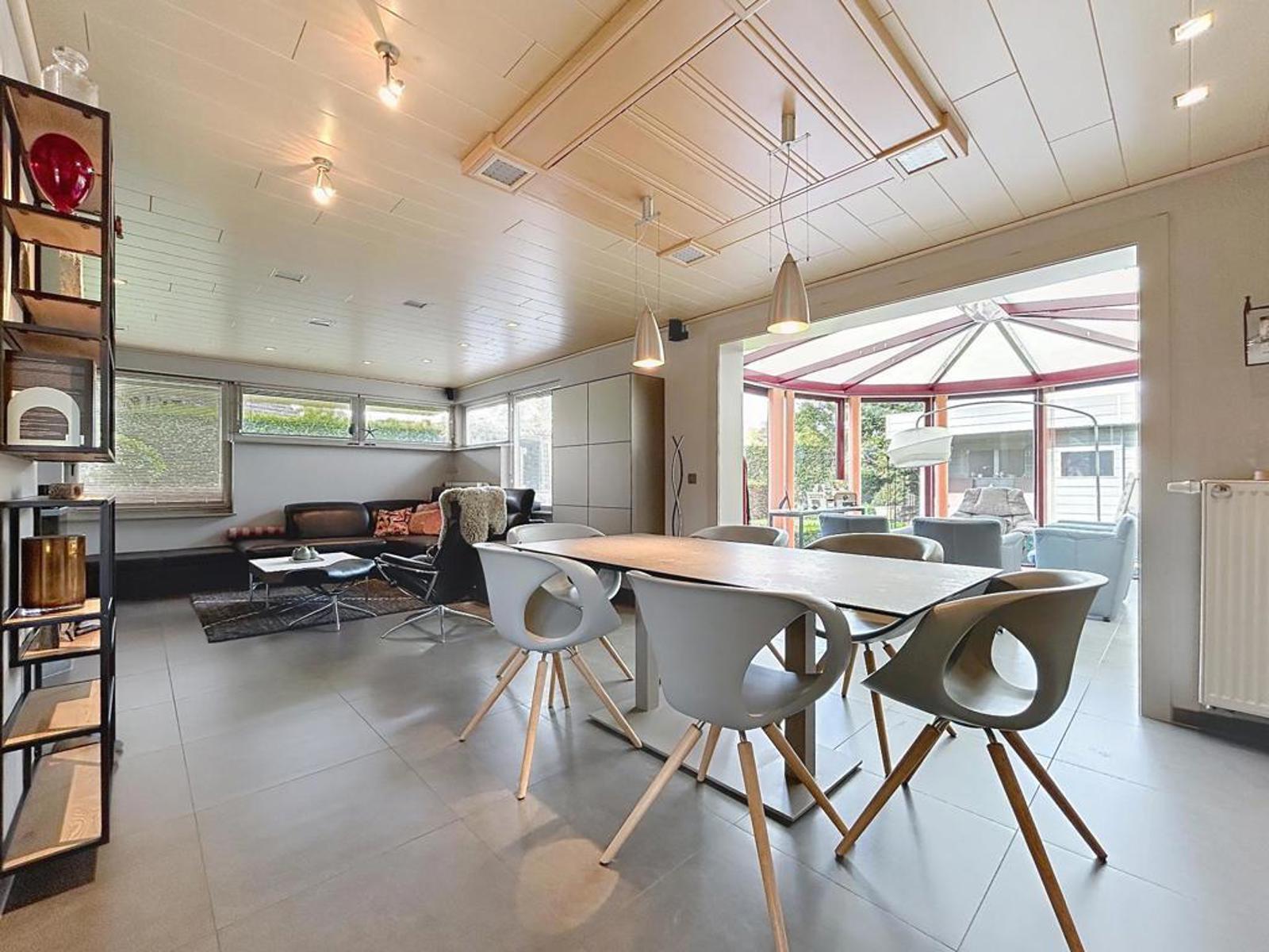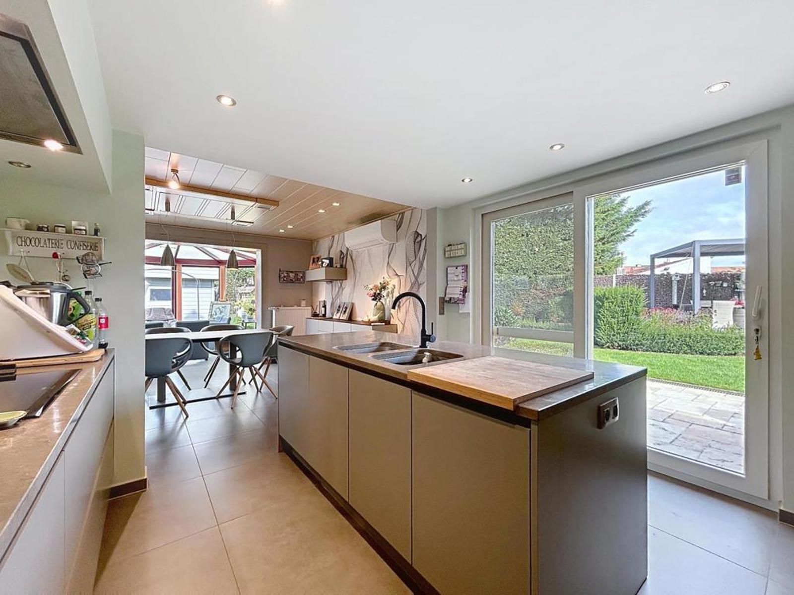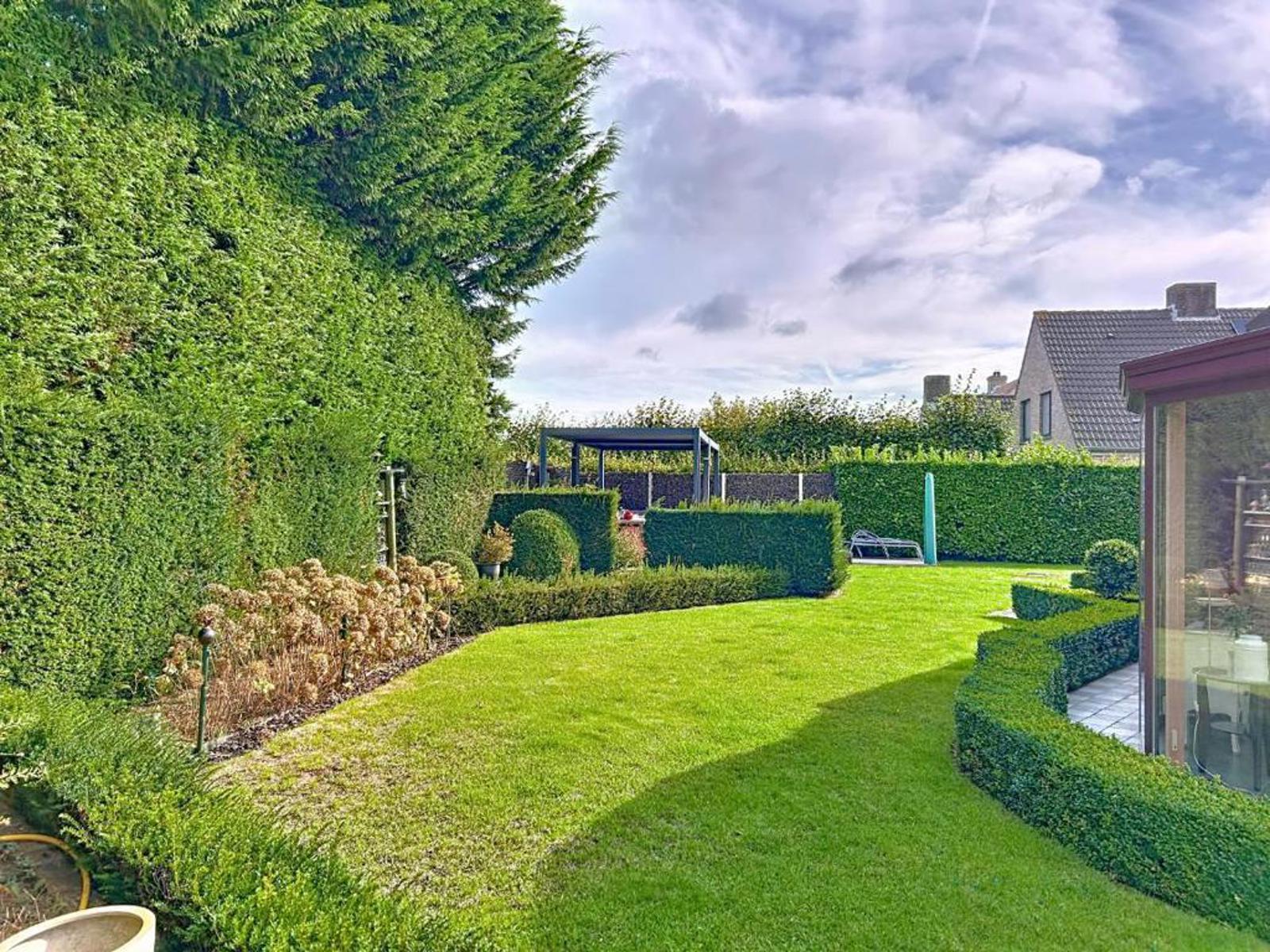 Gelijkvloers: inkomhal met gastentoilet, gezellige leefruimte met zit- en eethoek, volledig uitgeruste open keuken met eiland, ruime veranda/tuinkamer, bureel, eerste badkamer (lavabomeubel en inloopdouche), garage met wasplaats en een private tuin met aangelegde terrassen, overkapping en tuinberging.