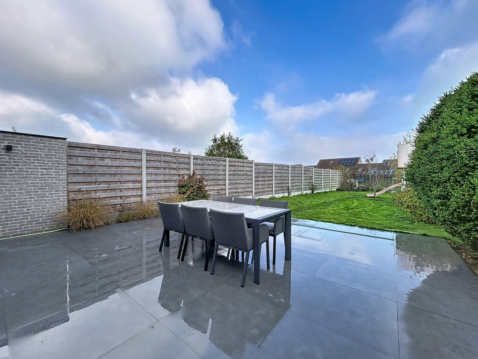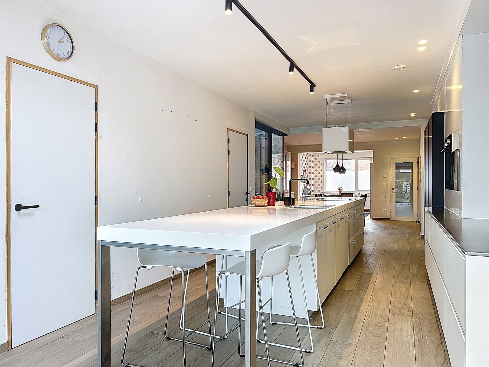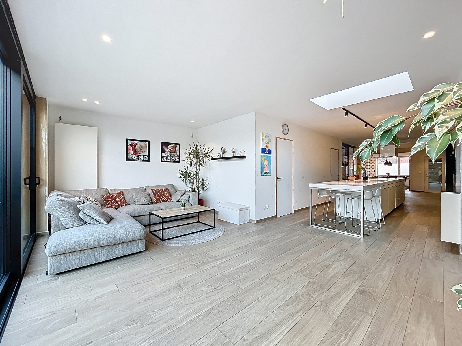 Centraal gelegen woning op 563 m², bestaande uit een inkomhal, ruime leefruimte met eet- en zithoek, bureau/polyvalente ruimte, prachtige volledig uitgeruste open keuken met kookeiland, patio, was-/bergplaats, afzonderlijk toilet en een zongerichte tuin met groot terras en uitweg op het achterliggende straatje. Op het 1ste verdiep bevinden zich 2 ruime slaapkamers, een ingerichte badkamer (inloopdouche, ligbad, toilet en dubbele lavabo) en een vaste trap naar de 2de verdieping die ingericht is als ruime 3de slaapkamer.