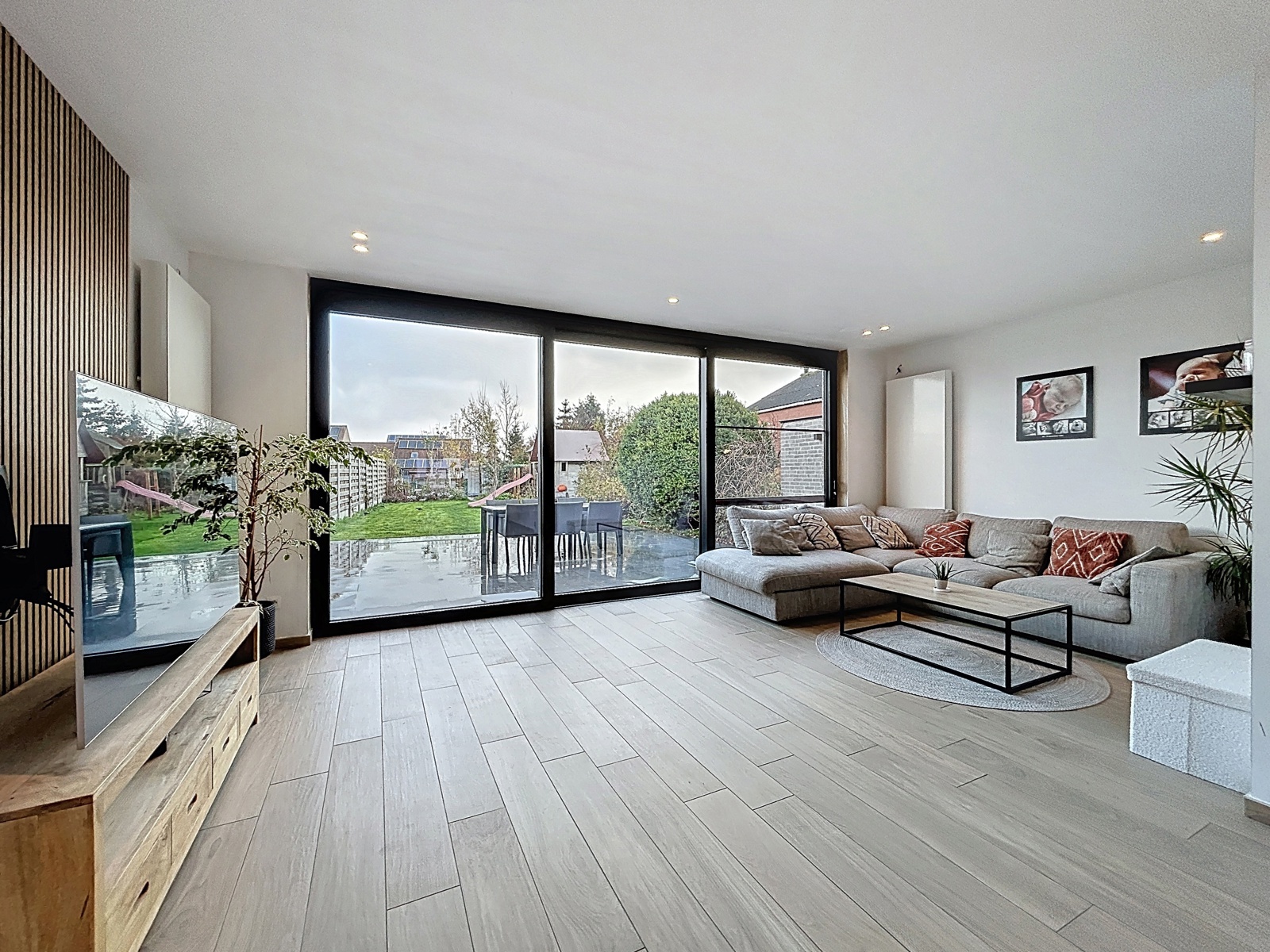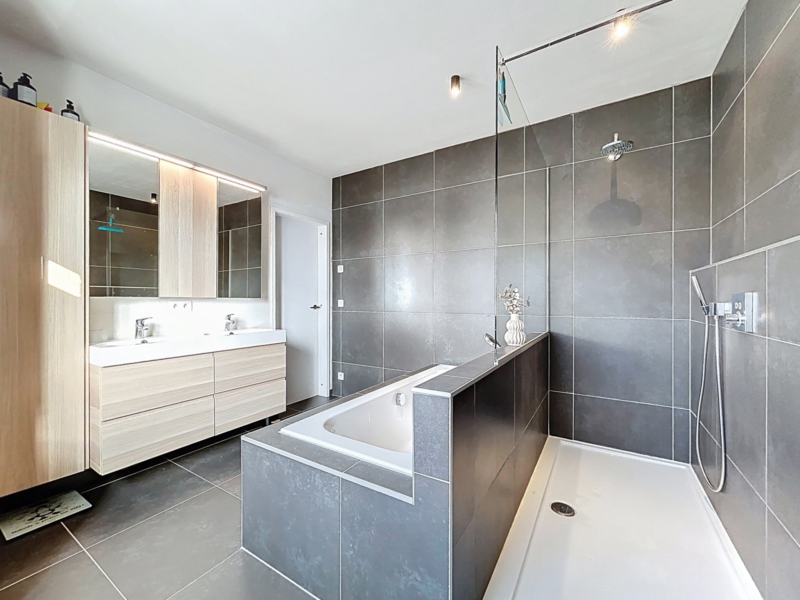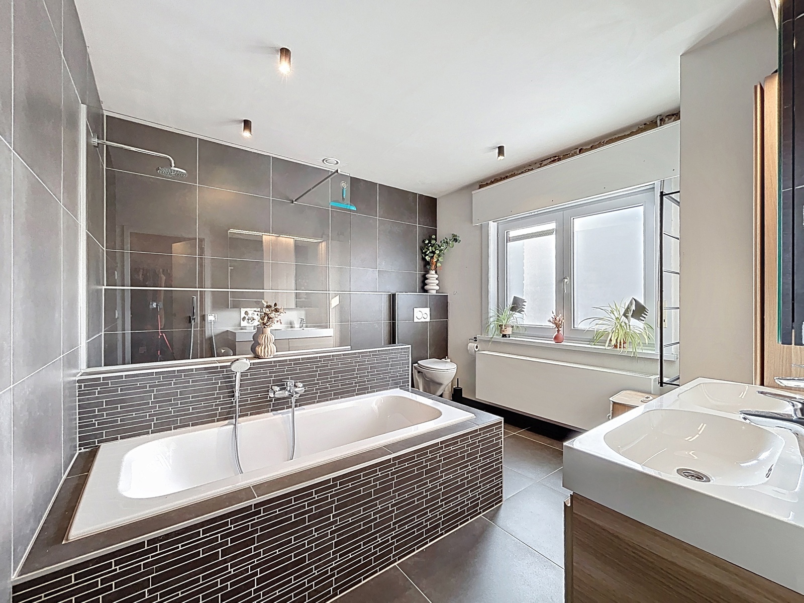 Centraal gelegen woning op 563 m², bestaande uit een inkomhal, ruime leefruimte met eet- en zithoek, bureau/polyvalente ruimte, prachtige volledig uitgeruste open keuken met kookeiland, patio, was-/bergplaats, afzonderlijk toilet en een zongerichte tuin met groot terras en uitweg op het achterliggende straatje. Op het 1ste verdiep bevinden zich 2 ruime slaapkamers, een ingerichte badkamer (inloopdouche, ligbad, toilet en dubbele lavabo) en een vaste trap naar de 2de verdieping die ingericht is als ruime 3de slaapkamer.