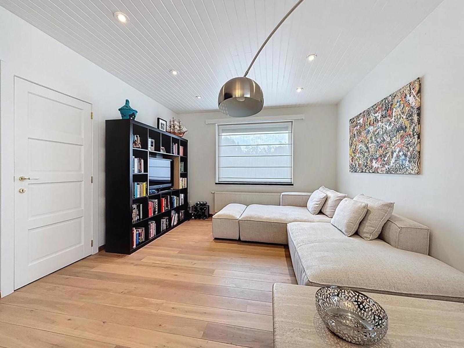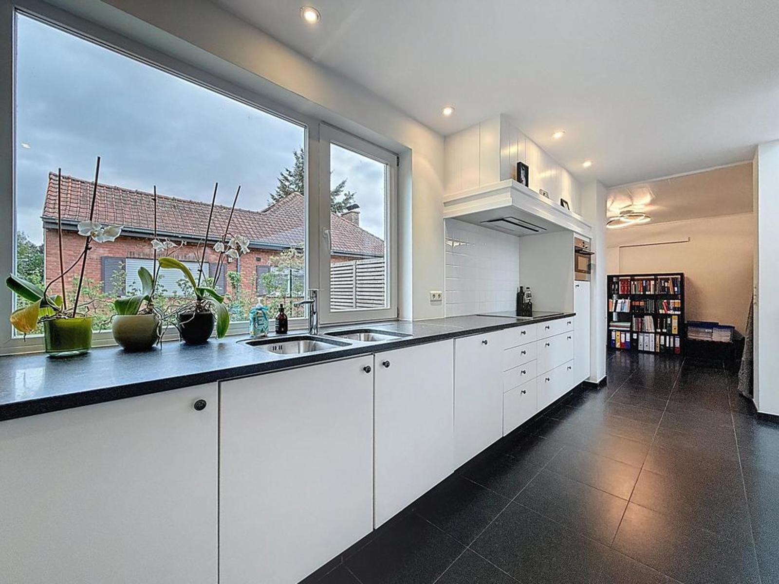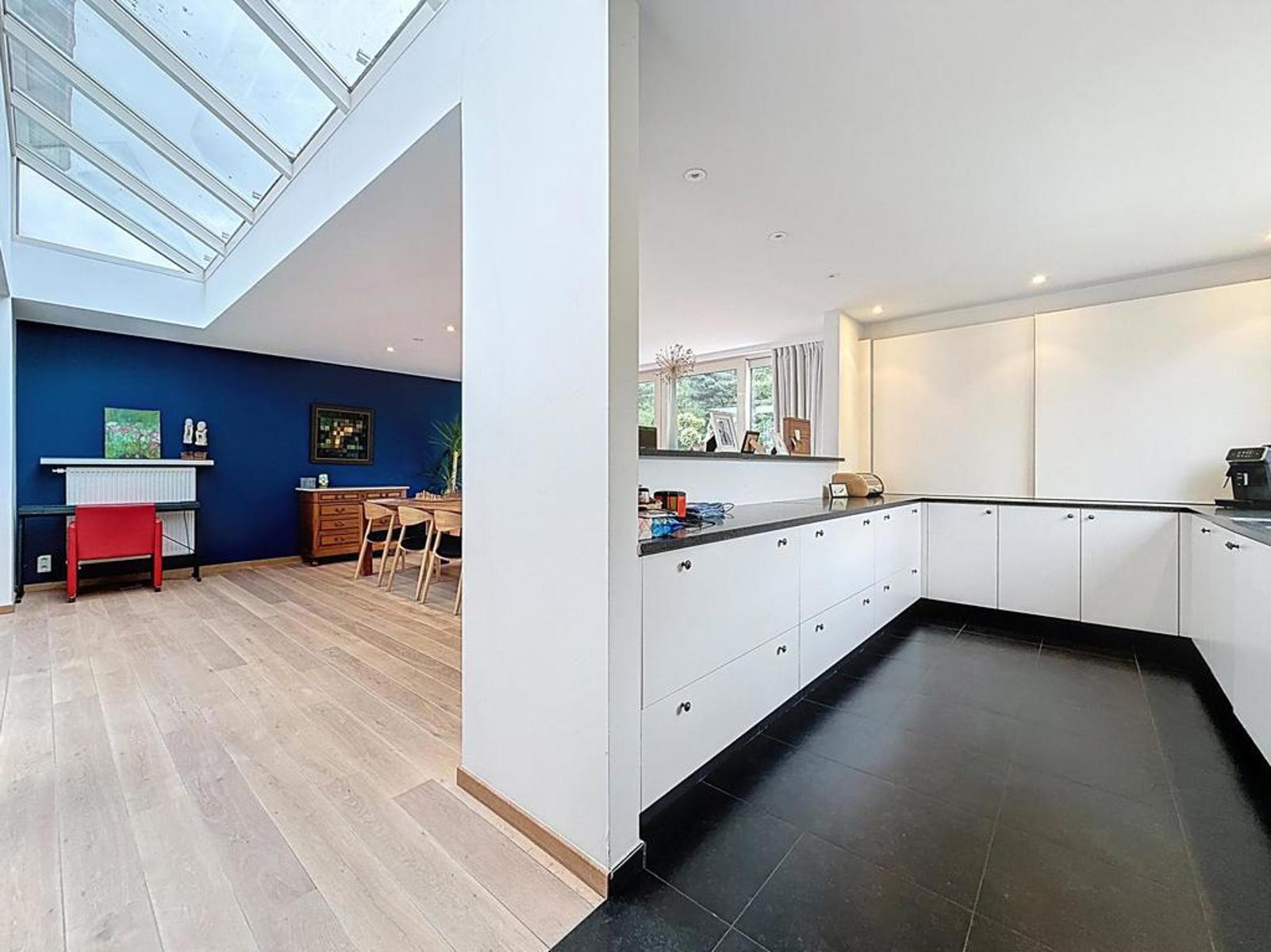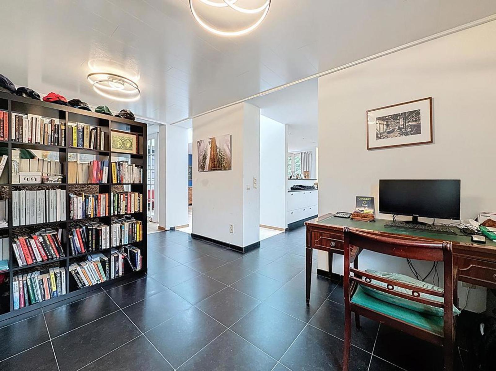 Klassevolle villa op een perceel van 898 m², bestaande uit een ruime inkomhal met apart gastentoilet, lichtrijke leefruimte met zithoek en strakke haard, volledig uitgeruste open keuken afgewerkt met graniet en aansluitend een grote eetruimte. Verder is er een ruim en praktisch bureau voor thuiswerk of hobby’s, en een prachtige, zuidgerichte tuin met zicht op het achterliggende bos en een recent aangelegde haag.