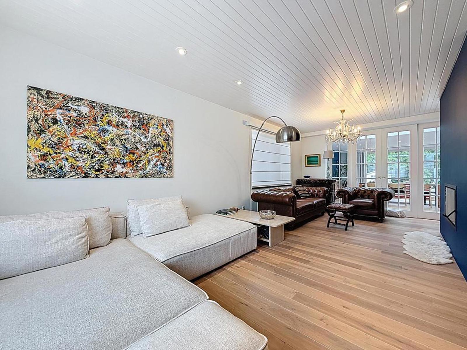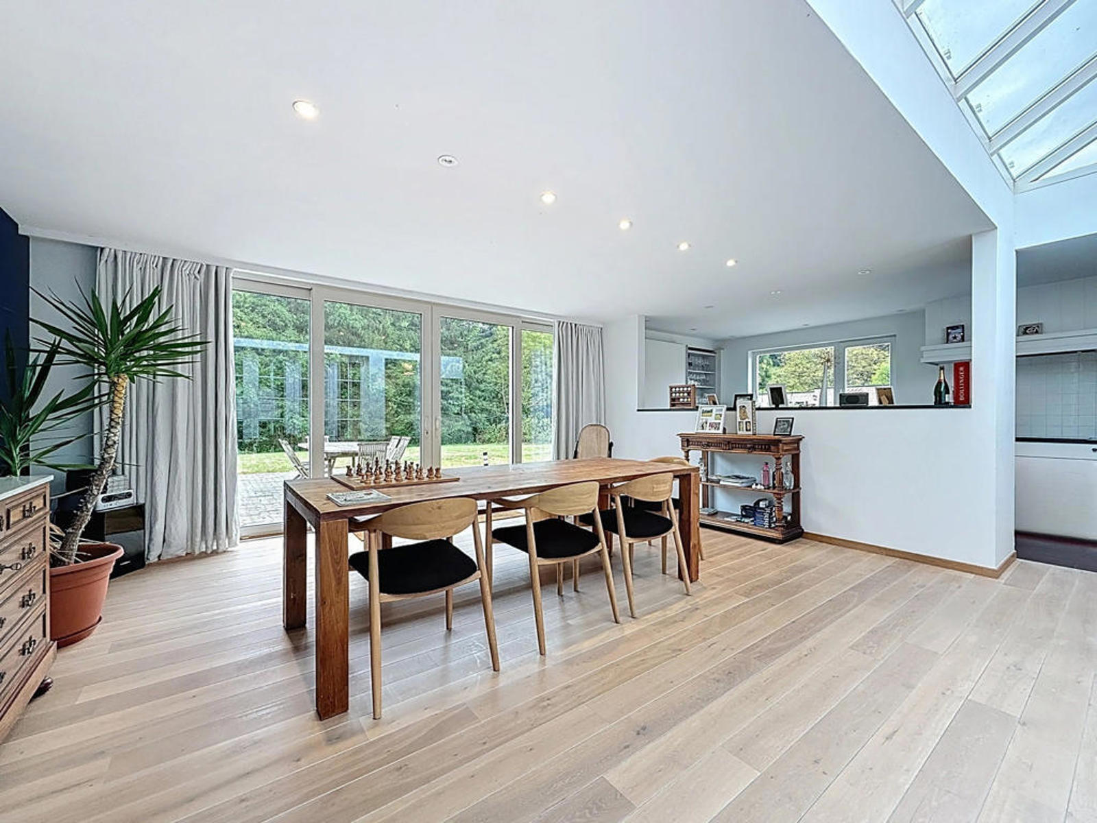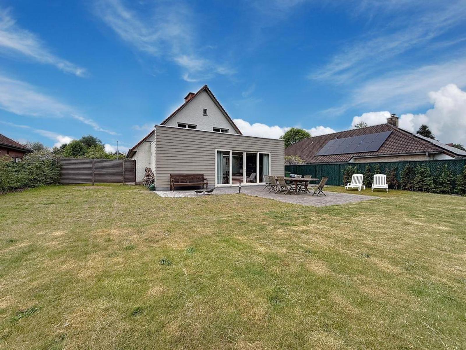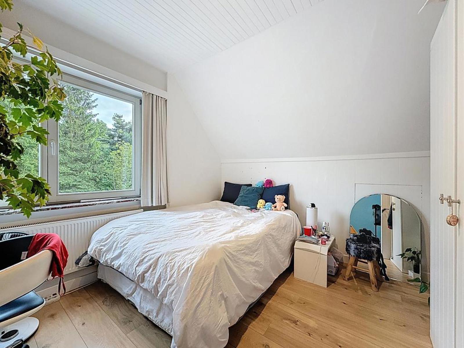 Klassevolle villa op een perceel van 898 m², bestaande uit een ruime inkomhal met apart gastentoilet, lichtrijke leefruimte met zithoek en strakke haard, volledig uitgeruste open keuken afgewerkt met graniet en aansluitend een grote eetruimte. Verder is er een ruim en praktisch bureau voor thuiswerk of hobby’s, en een prachtige, zuidgerichte tuin met zicht op het achterliggende bos en een recent aangelegde haag.