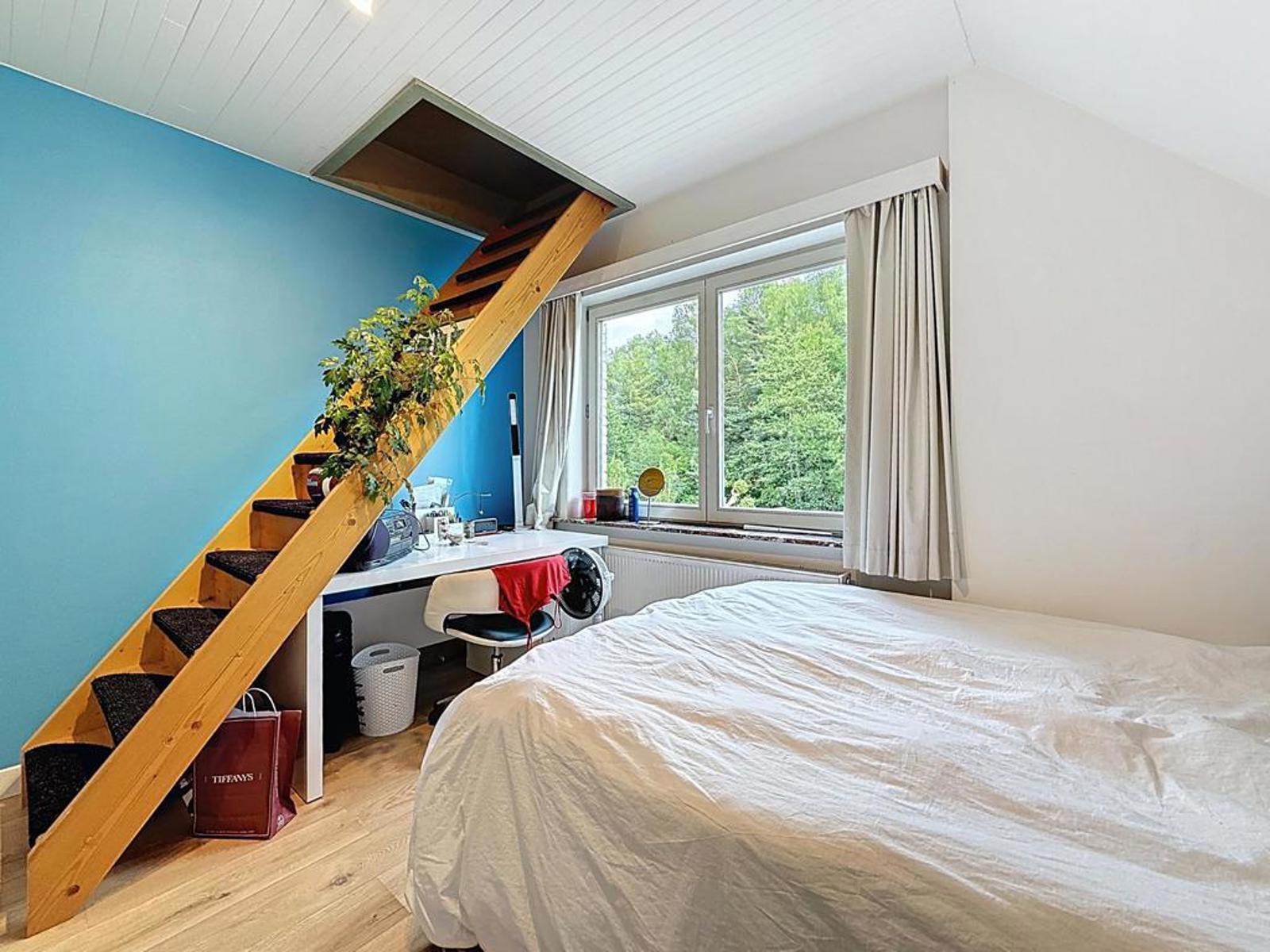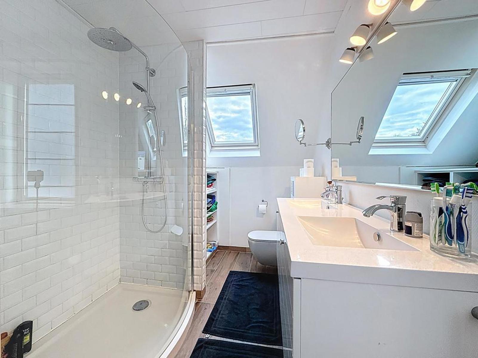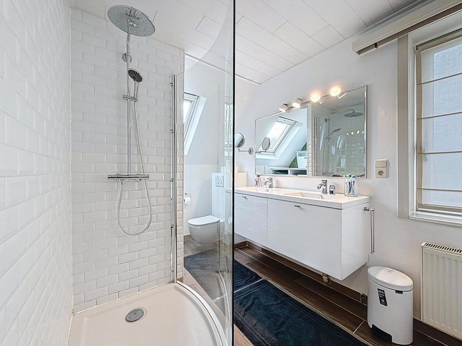 Op het eerste verdiep bevinden zich 3 ruime slaapkamers en een badkamer met douche, dubbele lavabo en toilet. Daarnaast is er ook nog een vaste trap naar de ruime, geïsoleerde zolder.