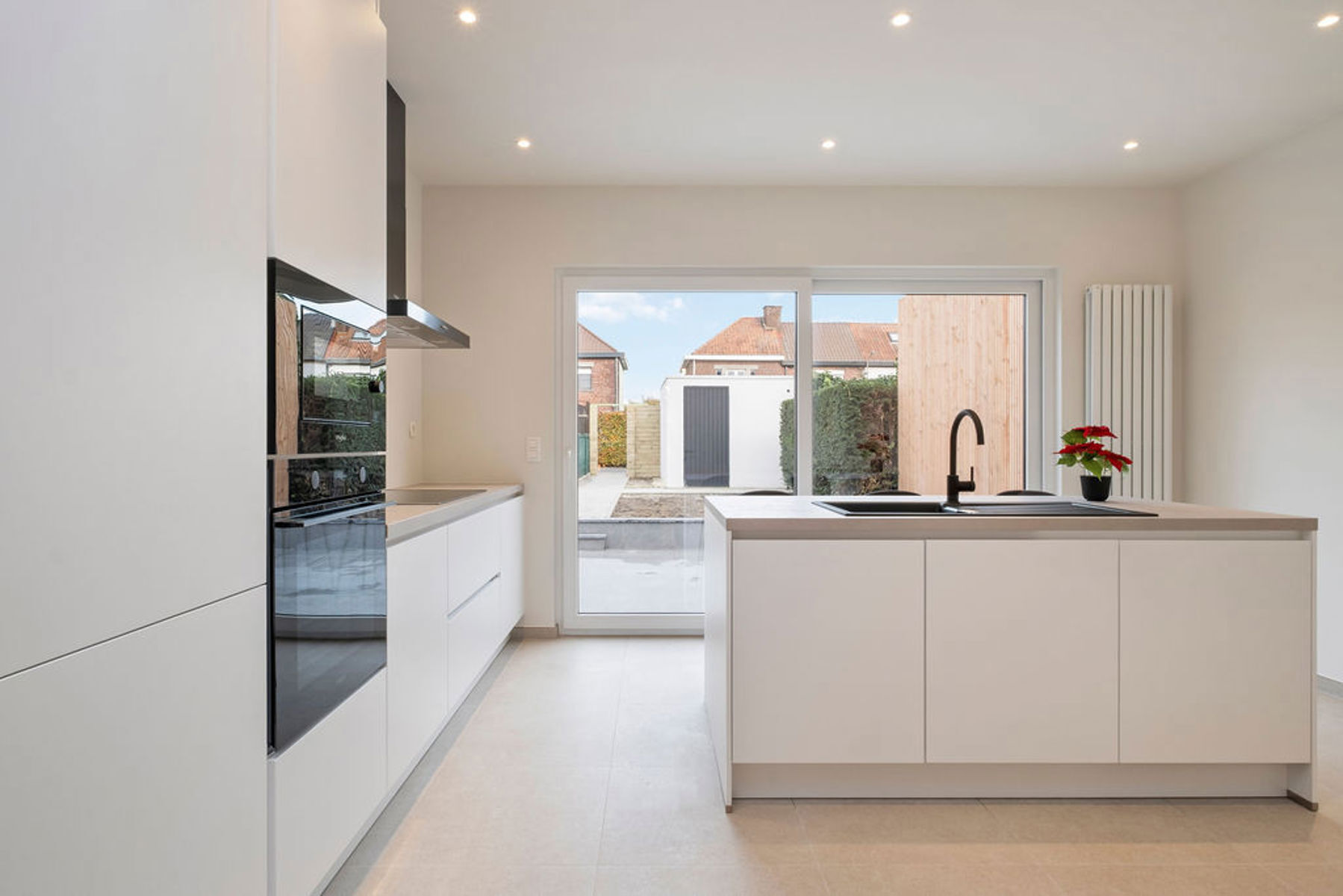 De keuken geeft uit op een nieuw aangelegd terras en een gezellige tuin met achteraan een ruime garage, bereikbaar via een tweede doodlopende straat. Dankzij het handige achterpoortje geniet je van een vlotte toegang tot de woning.