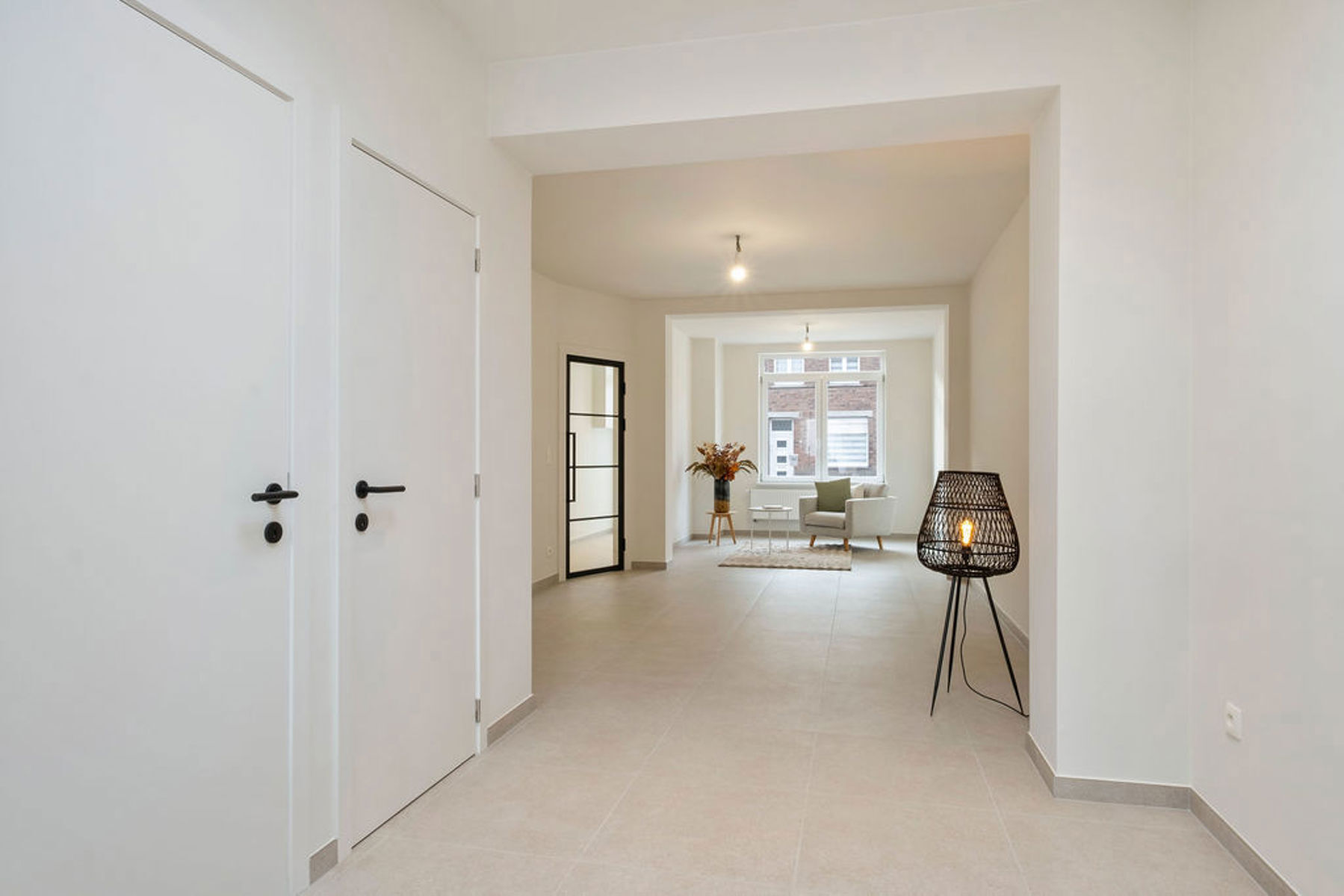 Je komt binnen in een lichtrijke inkomhal. Een elegante stalen deur geeft toegang tot de ruime open leefruimte met aansluitend een volledig uitgeruste keuken. Tussen de leefruimte en de keuken zijn er een apart toilet en een praktische berging/wasplaats.