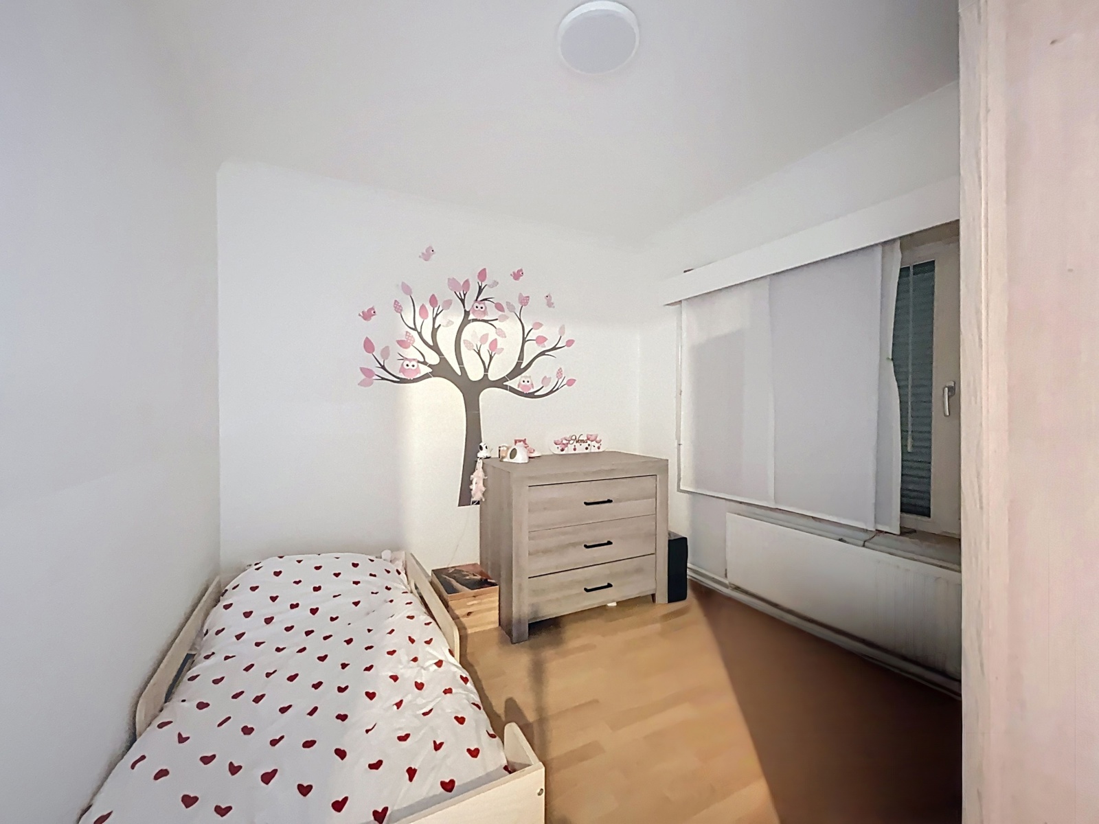 Op de 1ste verdieping zijn 2 ruime slaapkamers, kinderkamer, badkamer (douche en lavabo) en een trapluik naar de geïsoleerde zolder (met 2 veluxen) die mist het plaatsen van een vaste trap kan omgevormd worden naar een extra slaapkamer.