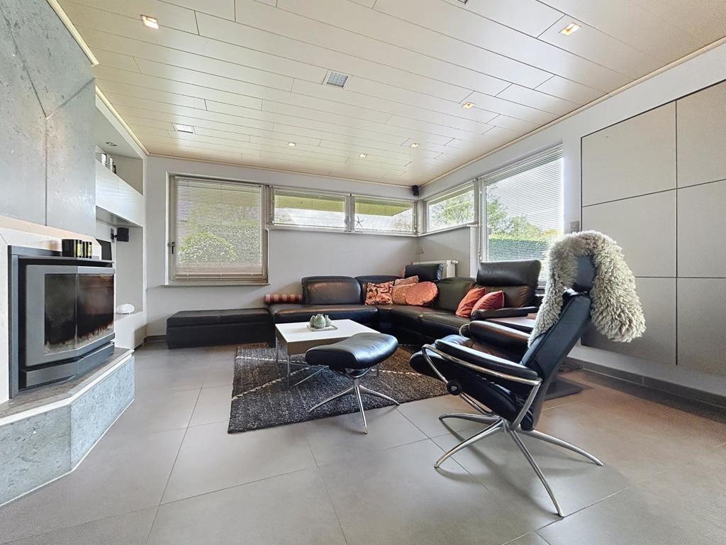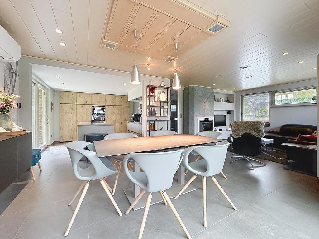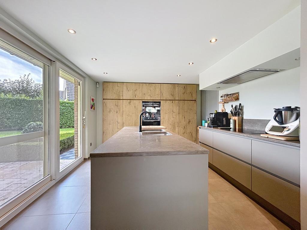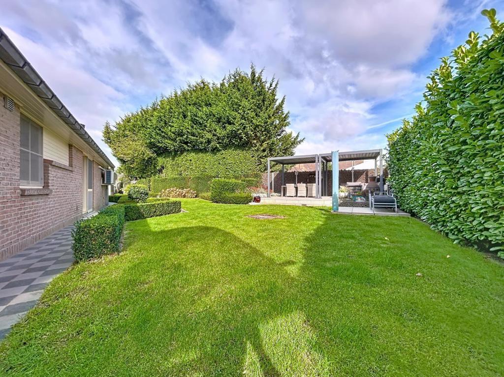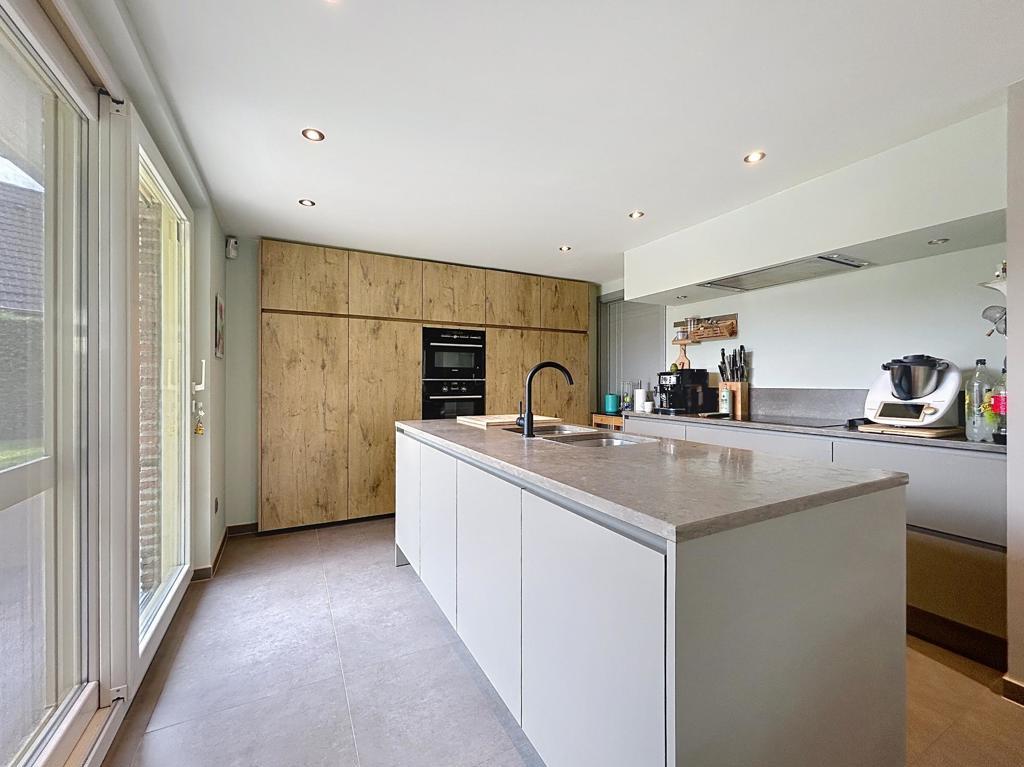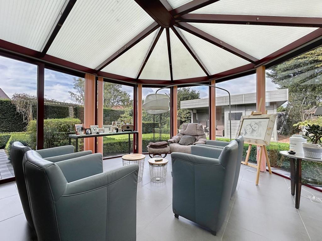 Gelijkvloers: inkomhal met gastentoilet, gezellige leefruimte met zit- en eethoek, volledig uitgeruste open keuken met eiland, ruime veranda/tuinkamer, bureel, eerste badkamer (lavabomeubel en inloopdouche), garage met wasplaats en een private tuin met aangelegde terrassen, overkapping en tuinberging.