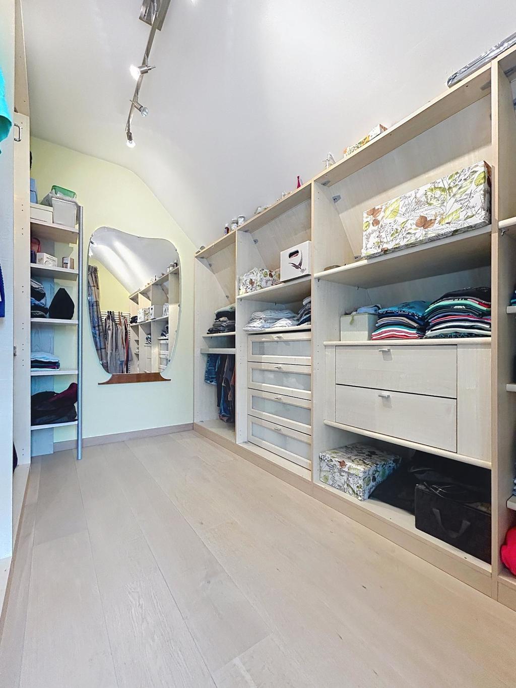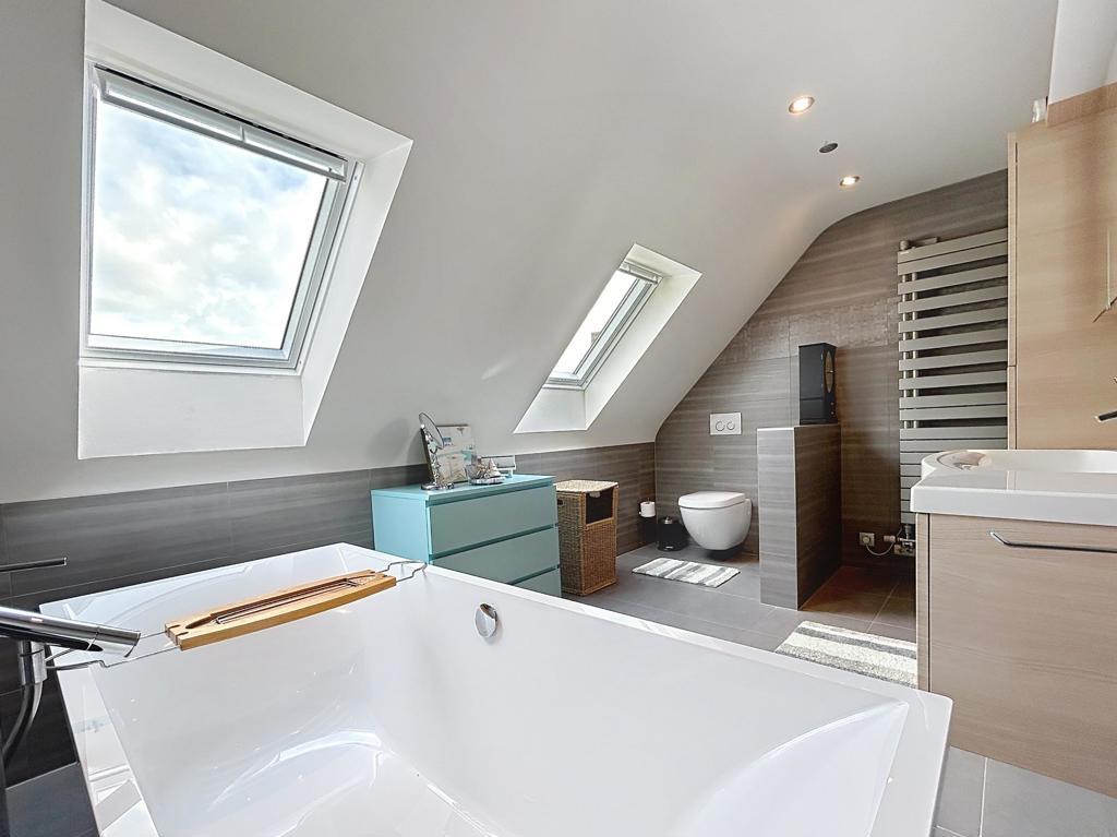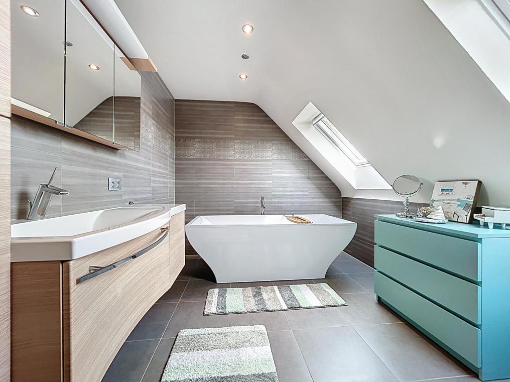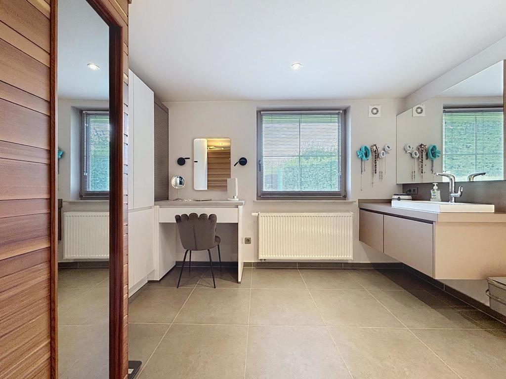 Op de verdieping bevinden zich vier ruime slaapkamers, waaronder een master bedroom met dressing en terras , een berging en een prachtige badkamer met losstaand bad, toilet en lavabomeubel. Via een trapluik is de bergzolder bereikbaar.