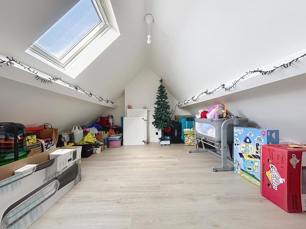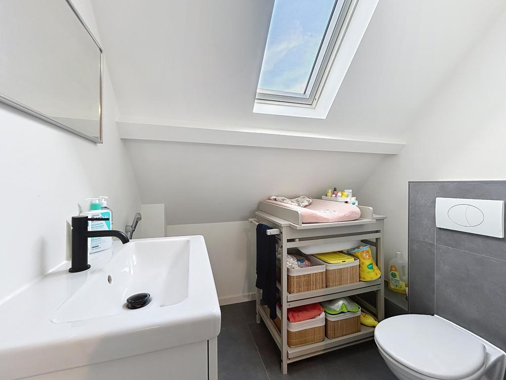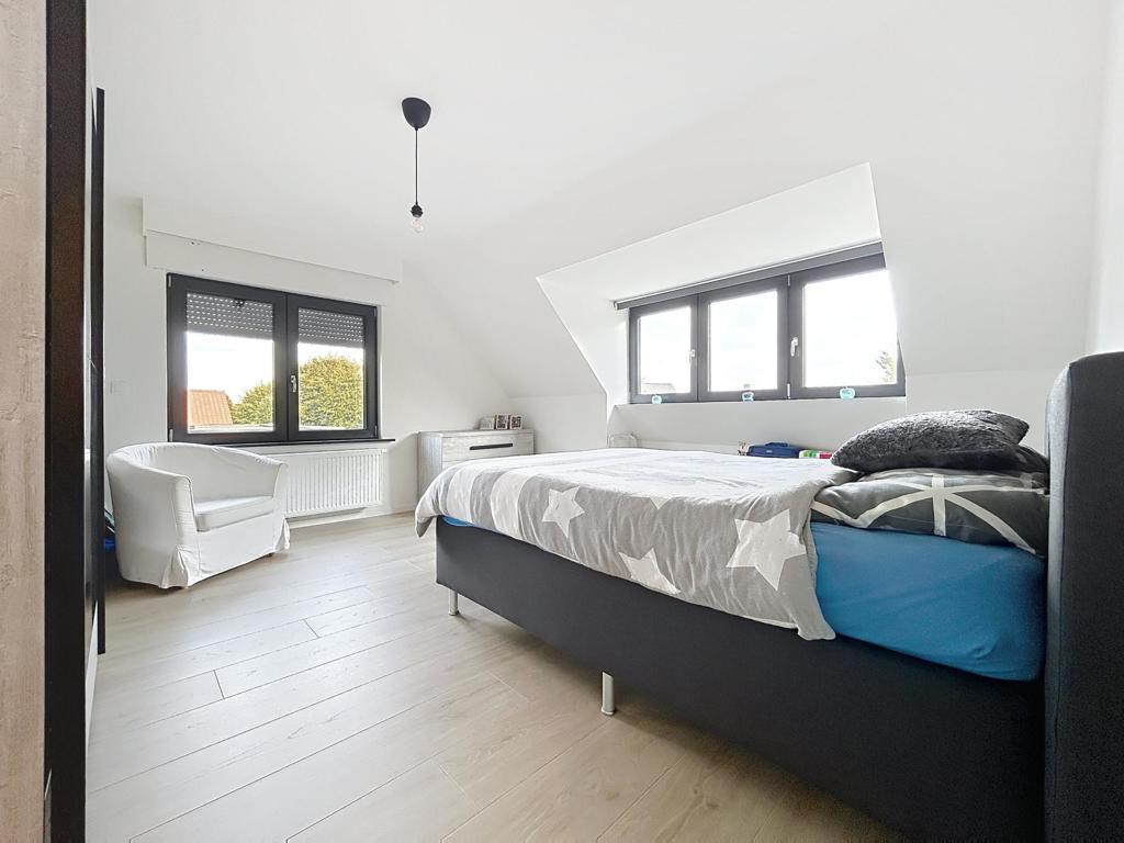 Energiezuinige woning op een centrale locatie, bestaande uit een inkomhal, ruime garage met sectionale poort, was-/bergplaats en extra bergruimte. Op het eerste verdiep bevindt zich een ruime, lichtrijke leefruimte met uitgeruste open keuken en ingerichte badkamer (douche, lavabomeubel en toilet). Het tweede verdiep telt drie slaapkamers, een toilet met lavabomeubel en een vaste trap naar de zolder, ingericht als vierde slaapkamer.