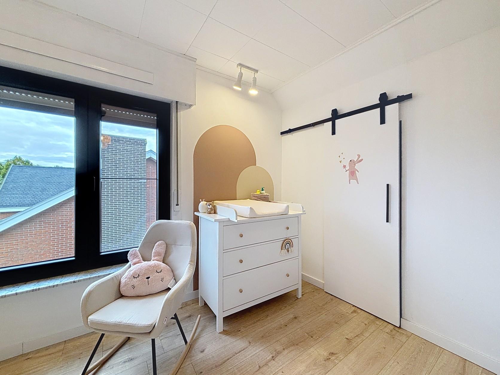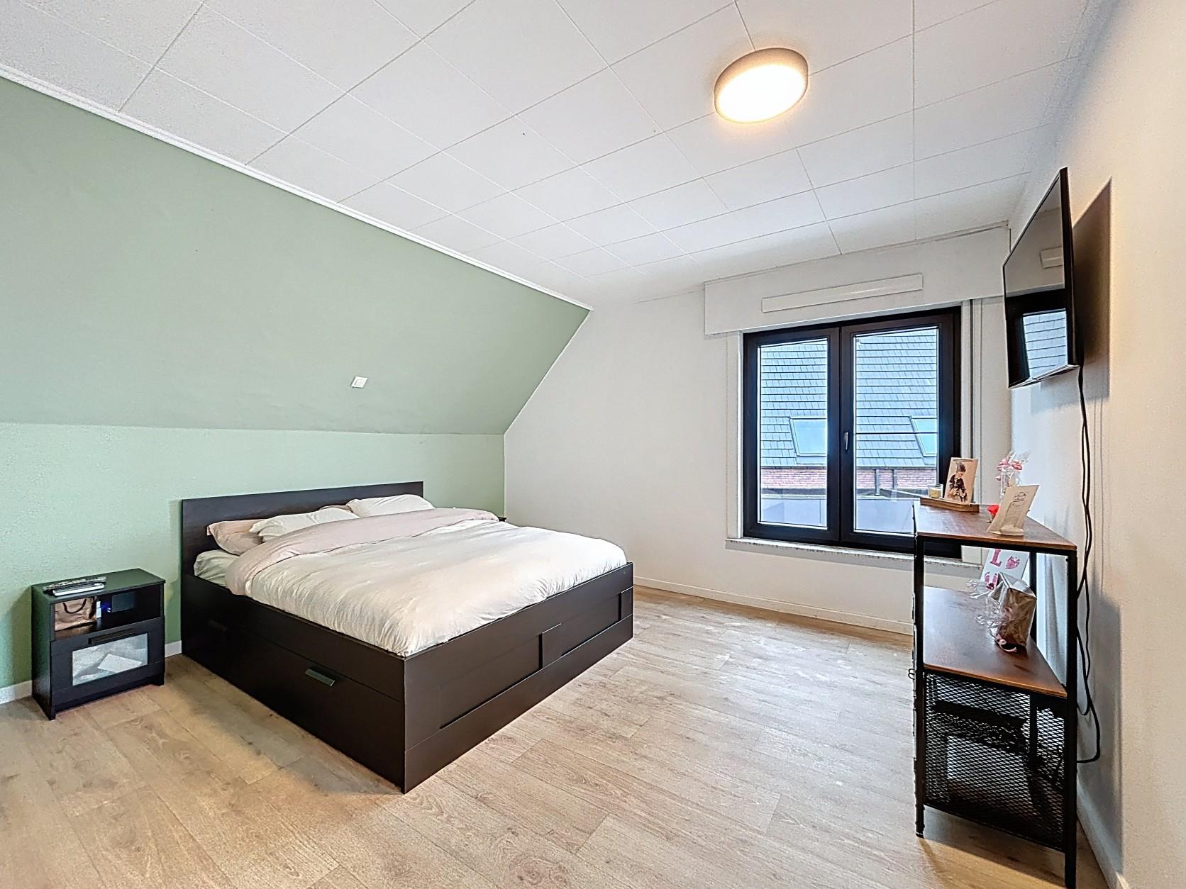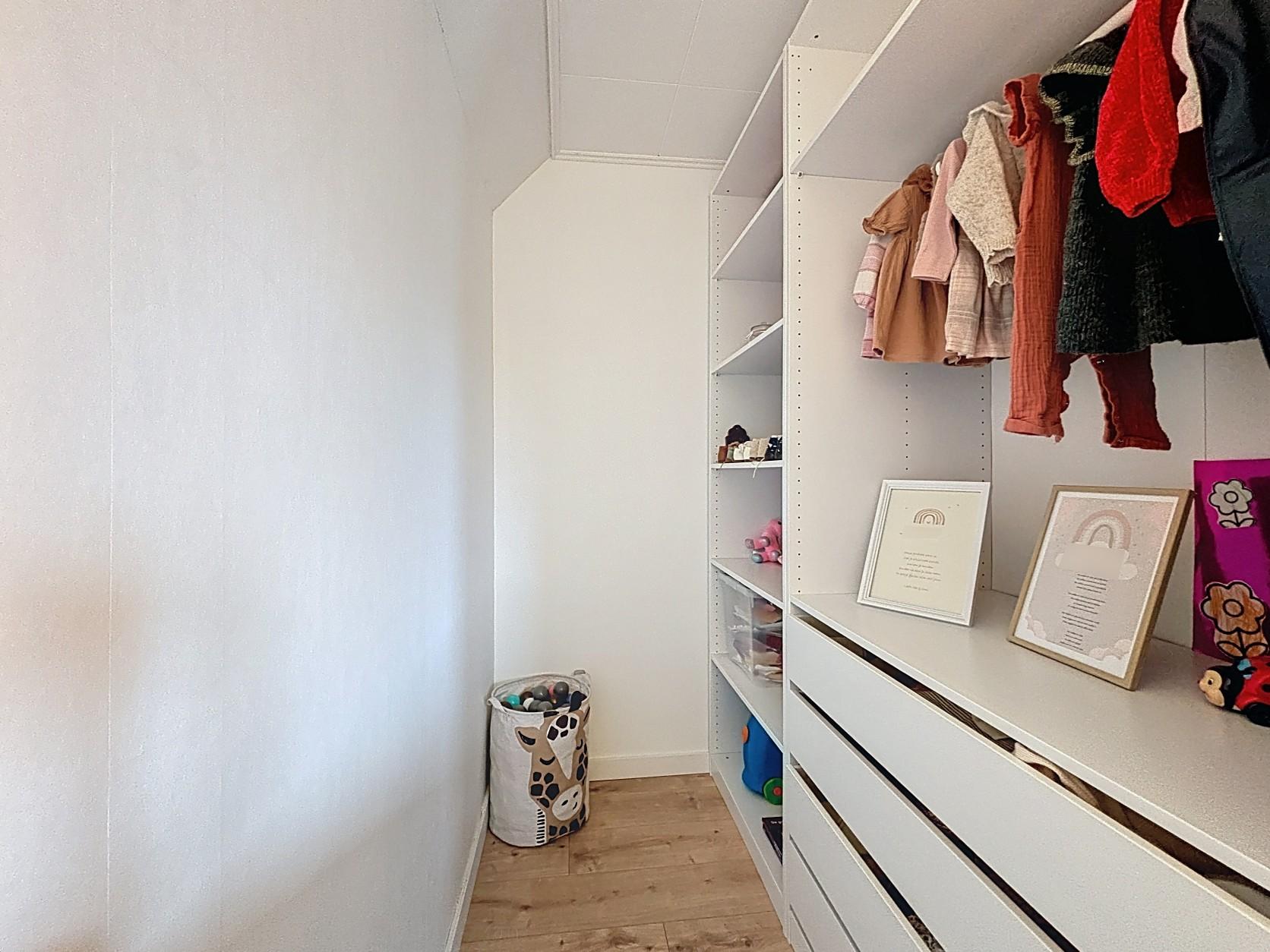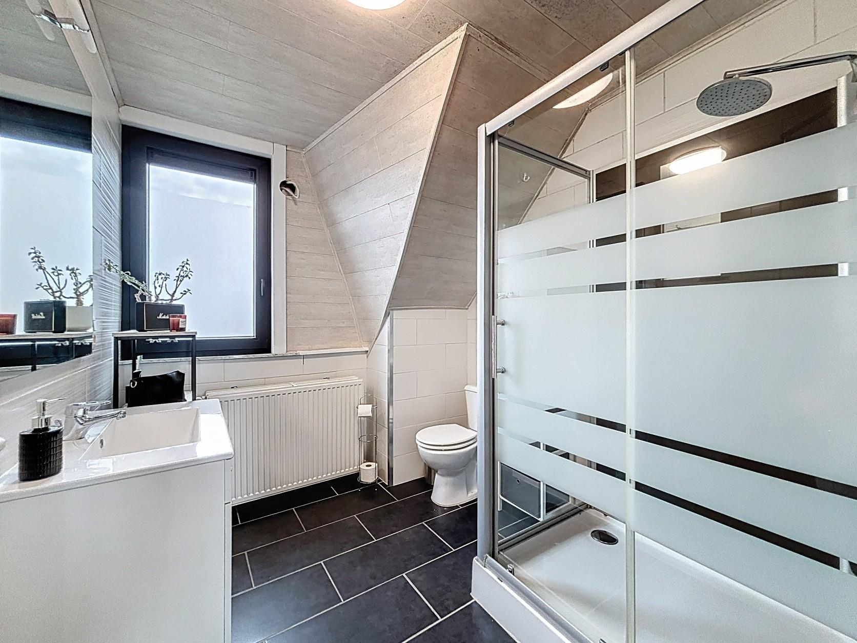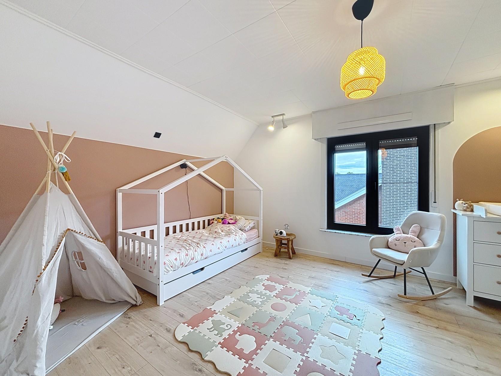 Verder beschikt de woning over een garage en extra parkeerruimte voor 3 wagens op de oprit. De tuin is volledig aangelegd met een groot terras en een ruime tuinberging – ideaal voor hobby of opslag. Op de eerste verdieping vind je 4 slaapkamers, waarvan 2 met eigen dressing. Er is een badkamer met douche, lavabo en toilet. Via het trapluik bereik je een ruime bergzolder, handig als extra opslagruimte.