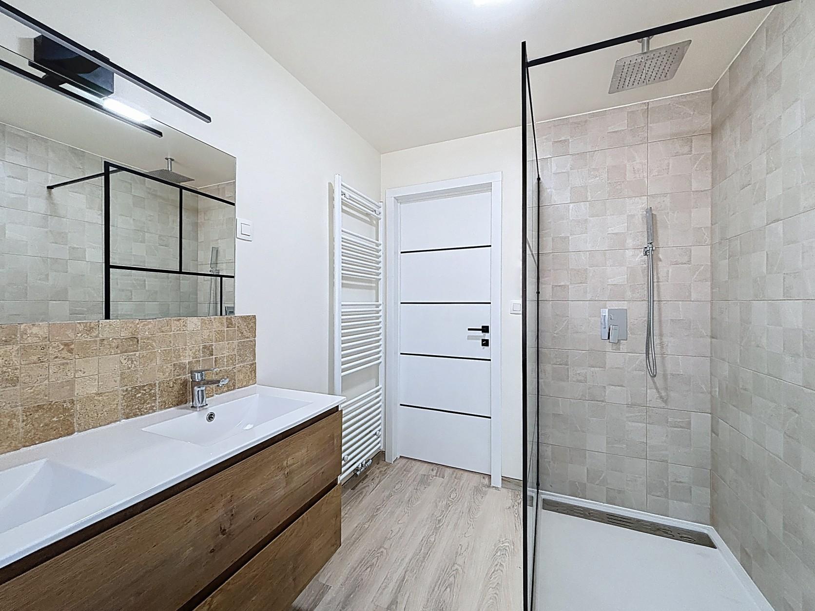 Op de eerste verdieping zijn er 2 ruime slaapkamers en een moderne badkamer met inloopdouche, dubbele lavabo en toilet.