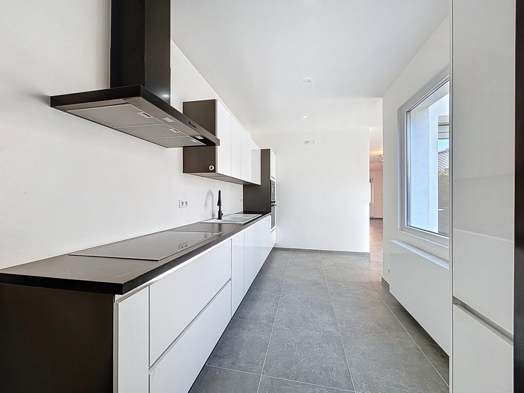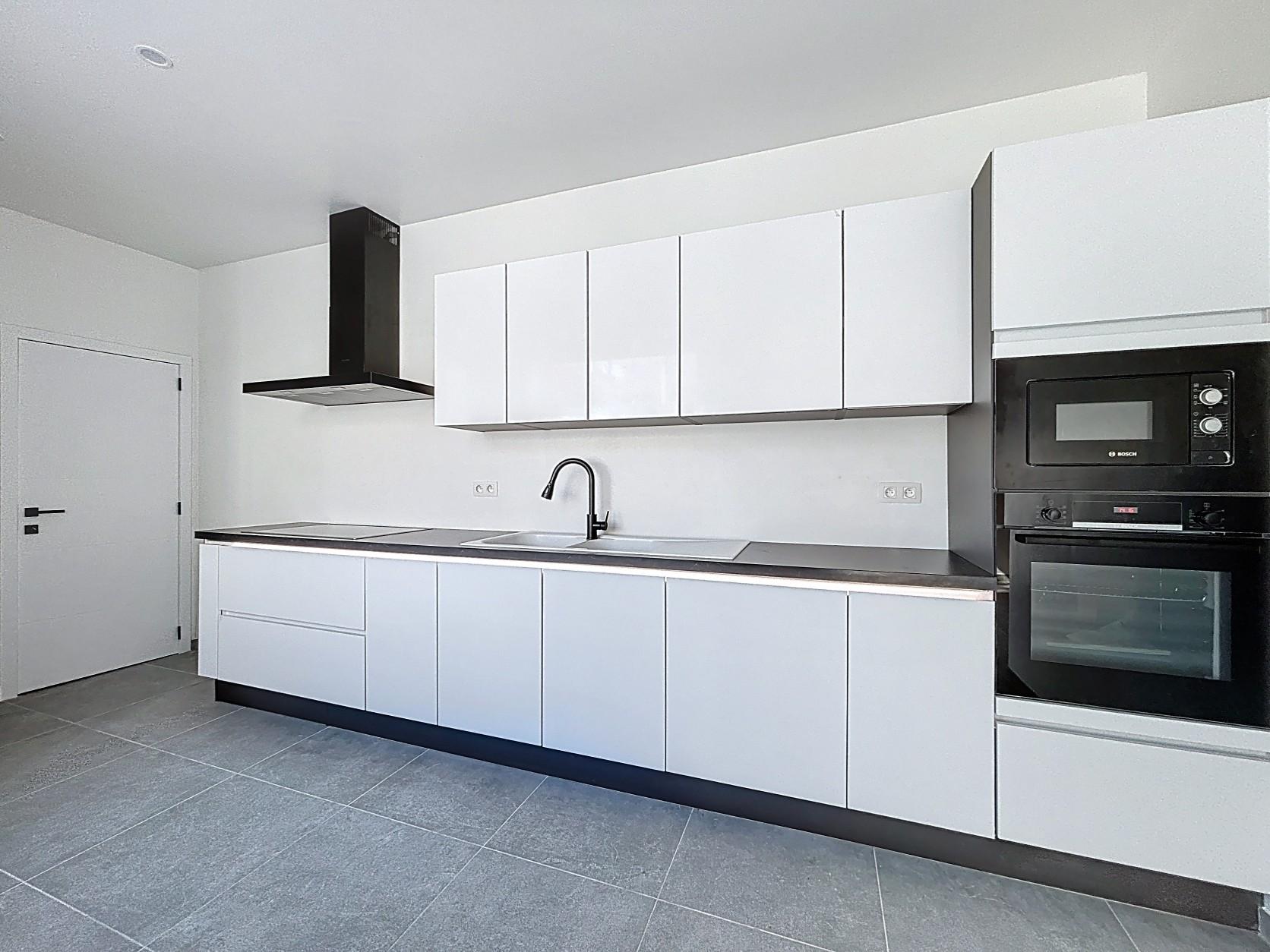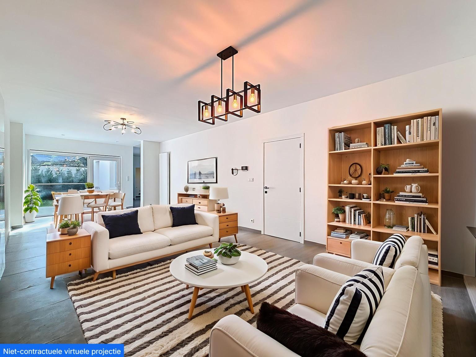 De lichtrijke leefruimte met zithoek en eetgedeelte sluit naadloos aan op de halfopen, volledig uitgeruste keuken met kwalitatieve toestellen.