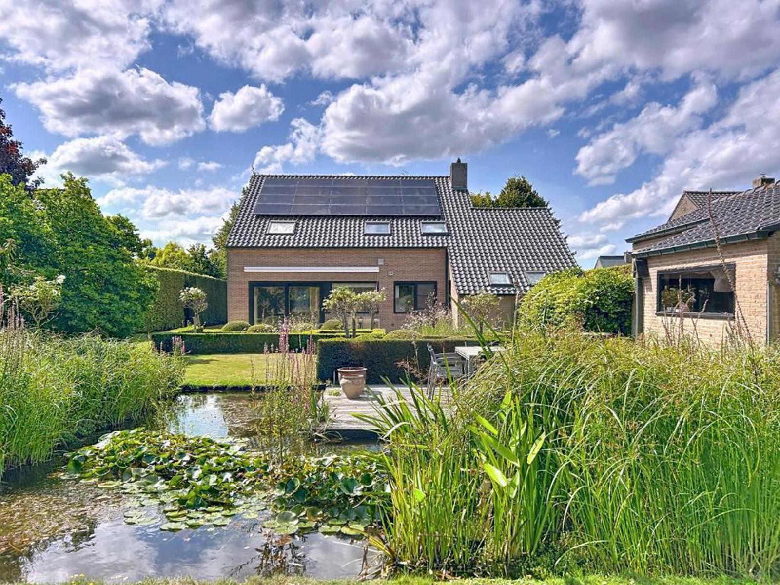 Villa met topligging, volledig omgeven door prachtige tuin, bestaande uit een inkomhal met vestiaire en afzonderlijk toilet, ruime en lichtrijke leefruimte met zit- en eethoek en bureelruimte, volledig uitgeruste open-keuken met eethoek, praktische was/bergplaats, inpandige garage, kelder, slaapkamer/bureel met aparte ingang en een afgewerkte zolder/slaapkamer met toilet. De woning beschikt daarnaast over een prachtig aangelegde tuin met 2 gezellige zonneterrassen en een losstaande garage van ca. 38 m².
